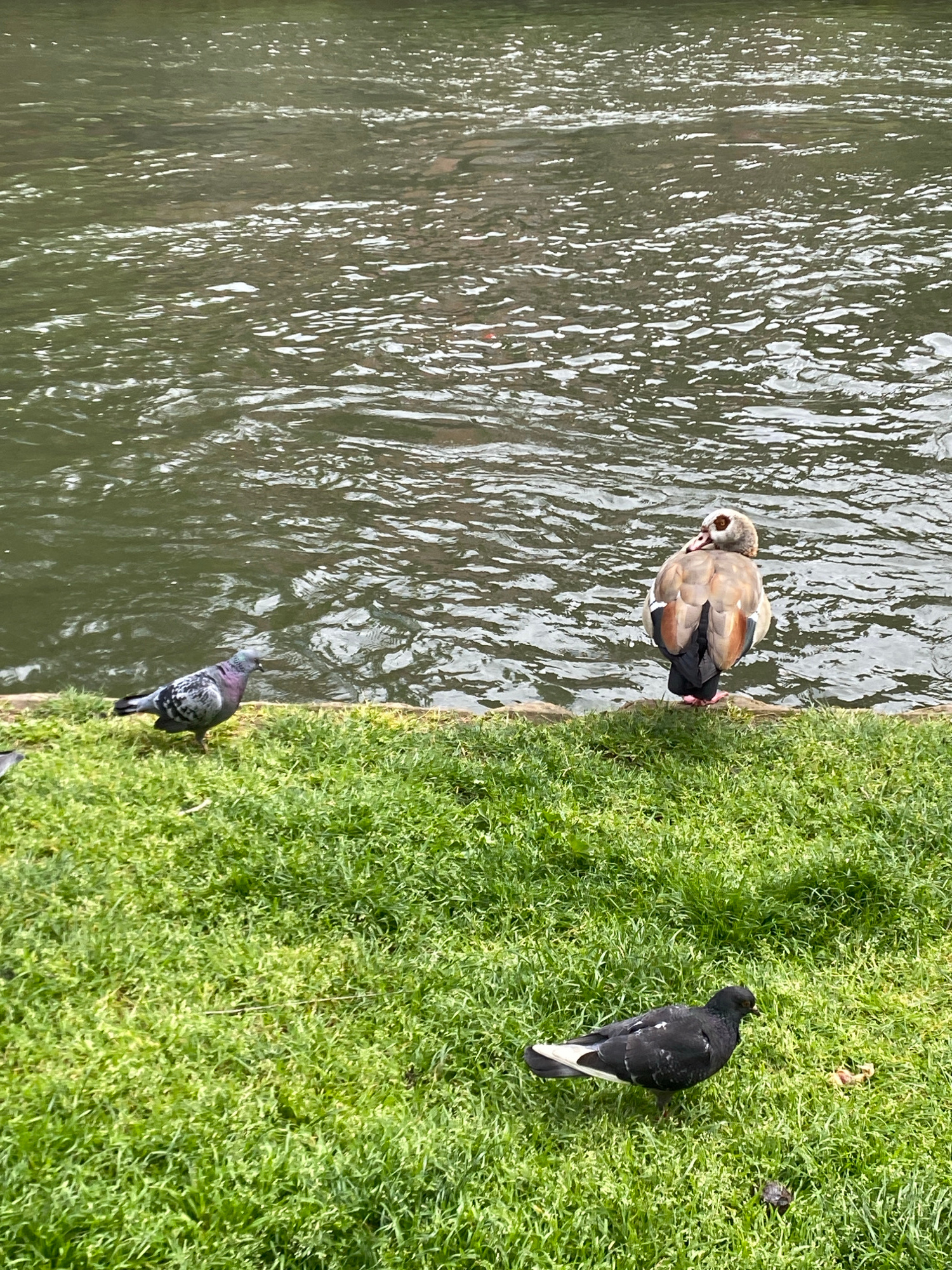 The image shows a section of the Quai des Bateliers in Strasbourg, France. A body of water, possibly the Ill River, fills the left side of the frame. Adjacent to the water is a grassy bank. On the banβ¦read more