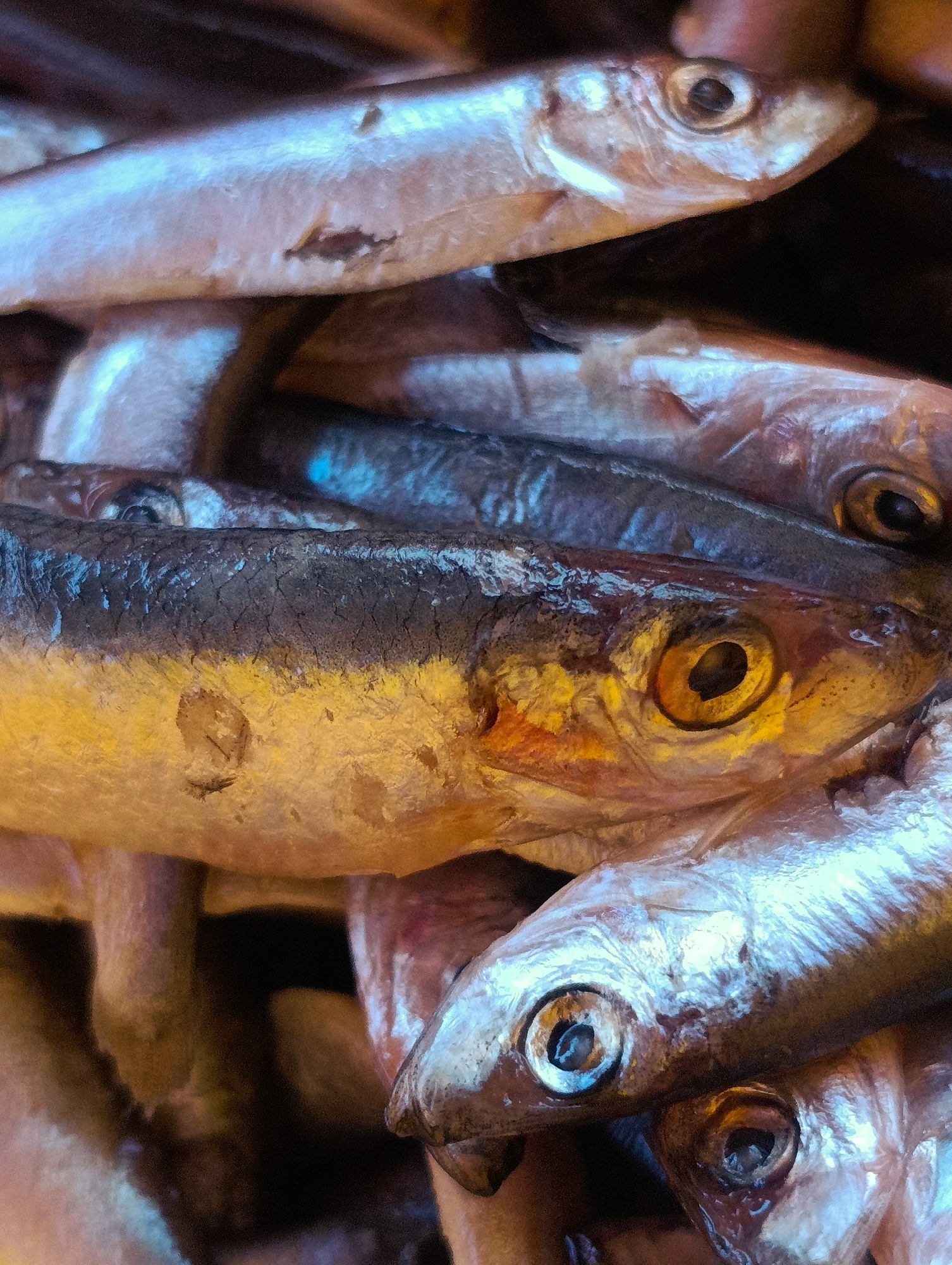 A close-up, medium-shot photograph shows a pile of small, silver-scaled fish, likely sardines or anchovies, heaped together. The fish vary in color, with some appearing more silver and others exhibiti…read more
