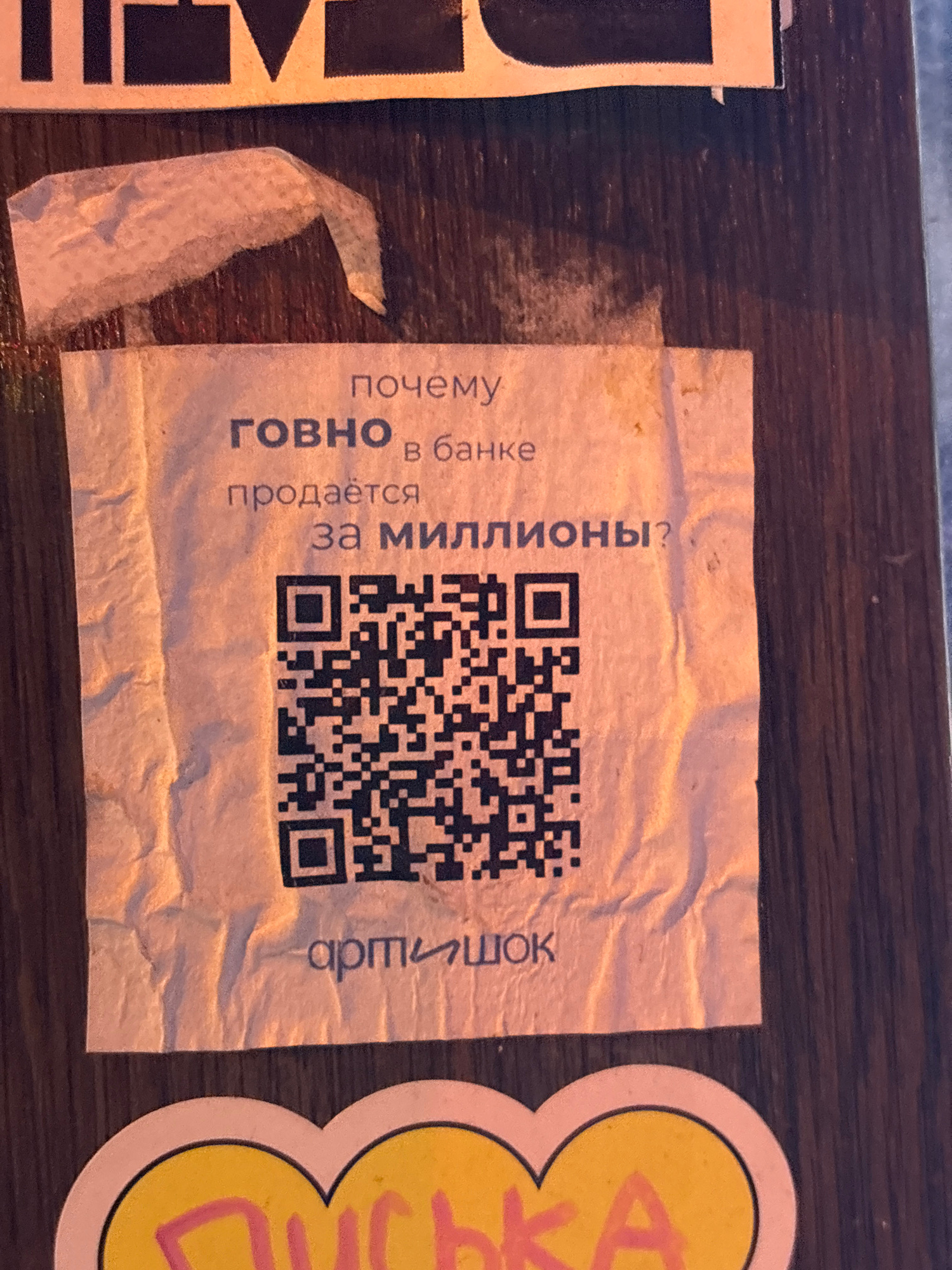 A rectangular, off-white sticker, appearing somewhat wrinkled and worn, is affixed to a dark, wooden-textured surface. The sticker prominently features a QR code in its center. To the left of the QR…read more