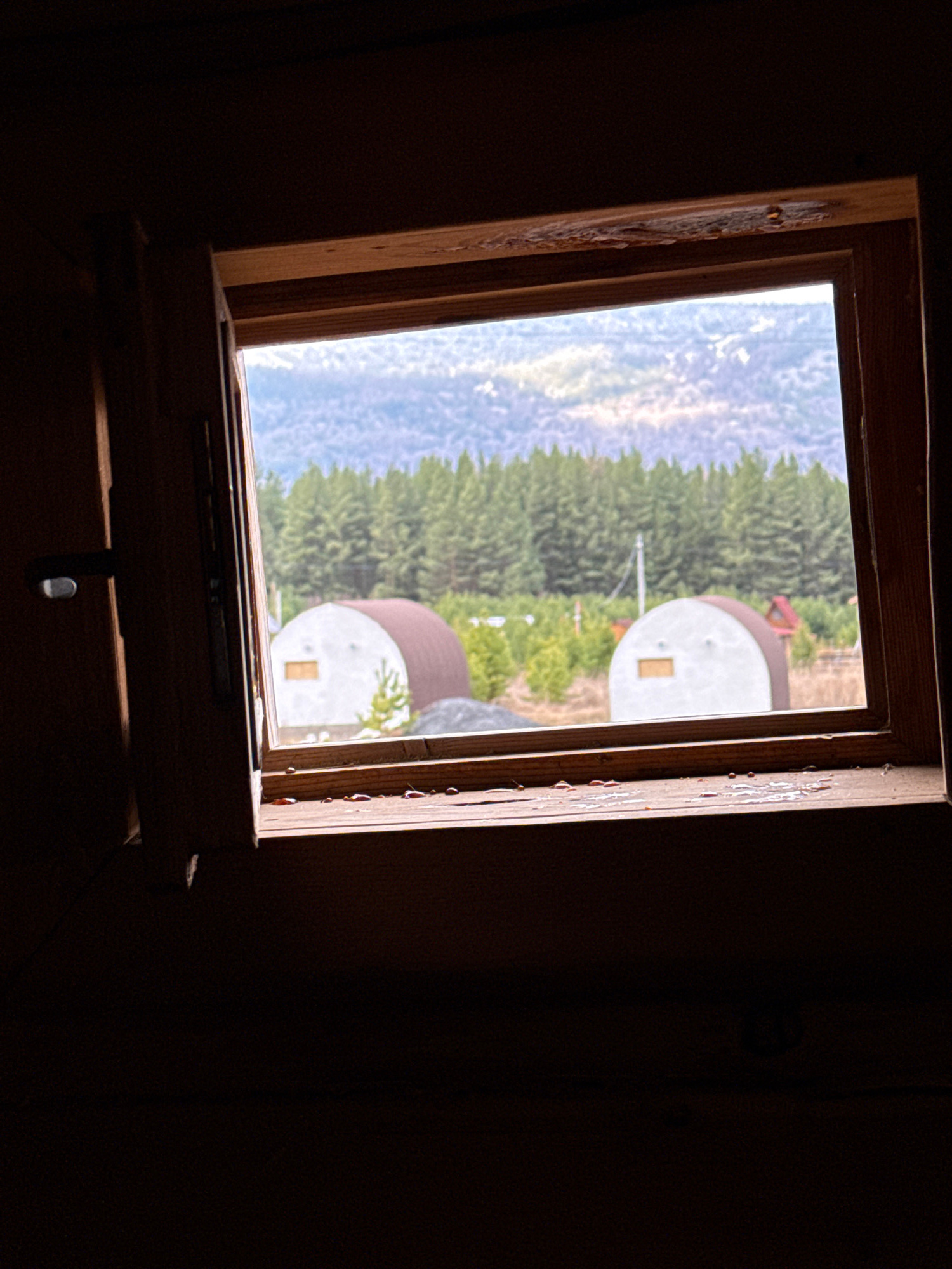 The image depicts a view through a wooden-framed window, likely from inside a dark room. Outside the window, the landscape includes a hillside with coniferous trees and two white, domed structures wit…read more