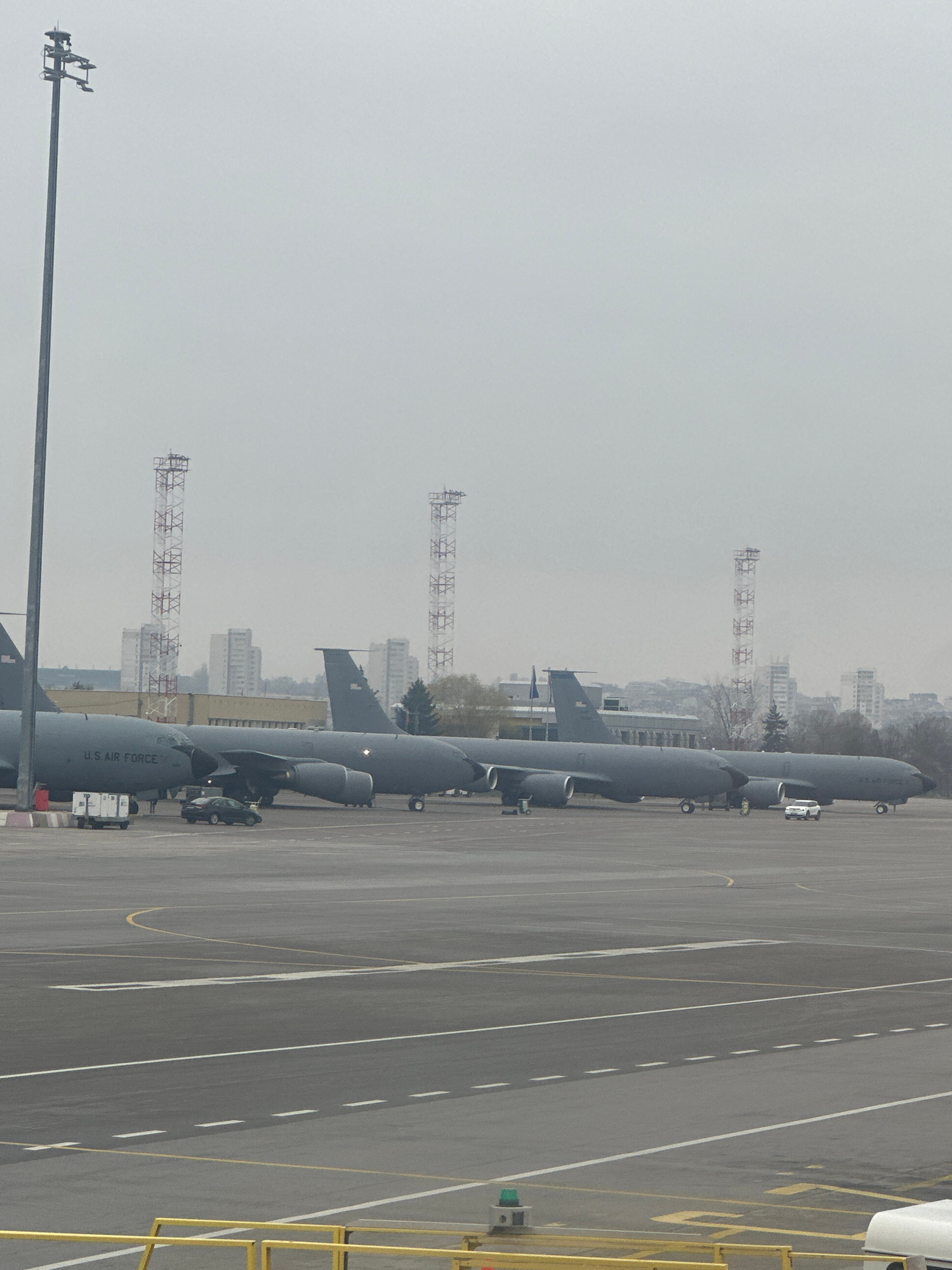 The image shows several U.S. Air Force KC-135 Stratotanker aircraft lined up on a concrete tarmac, presumably at an airport. In the background are blurred city buildings and transmission towers, possi…read more