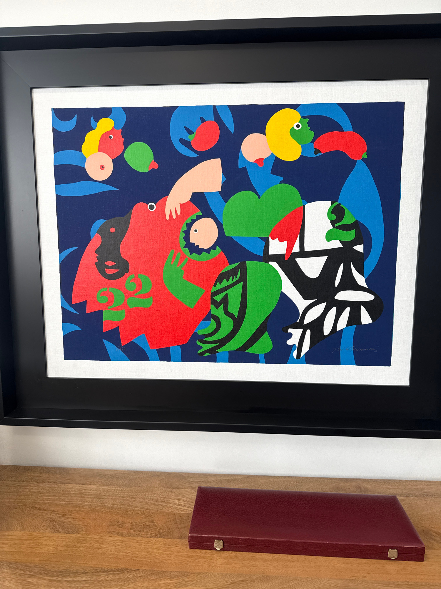 A framed abstract artwork is positioned against a white wall, resting above a polished wooden surface. The artwork, a print, features a dark blue background populated by various stylized figures and g…read more
