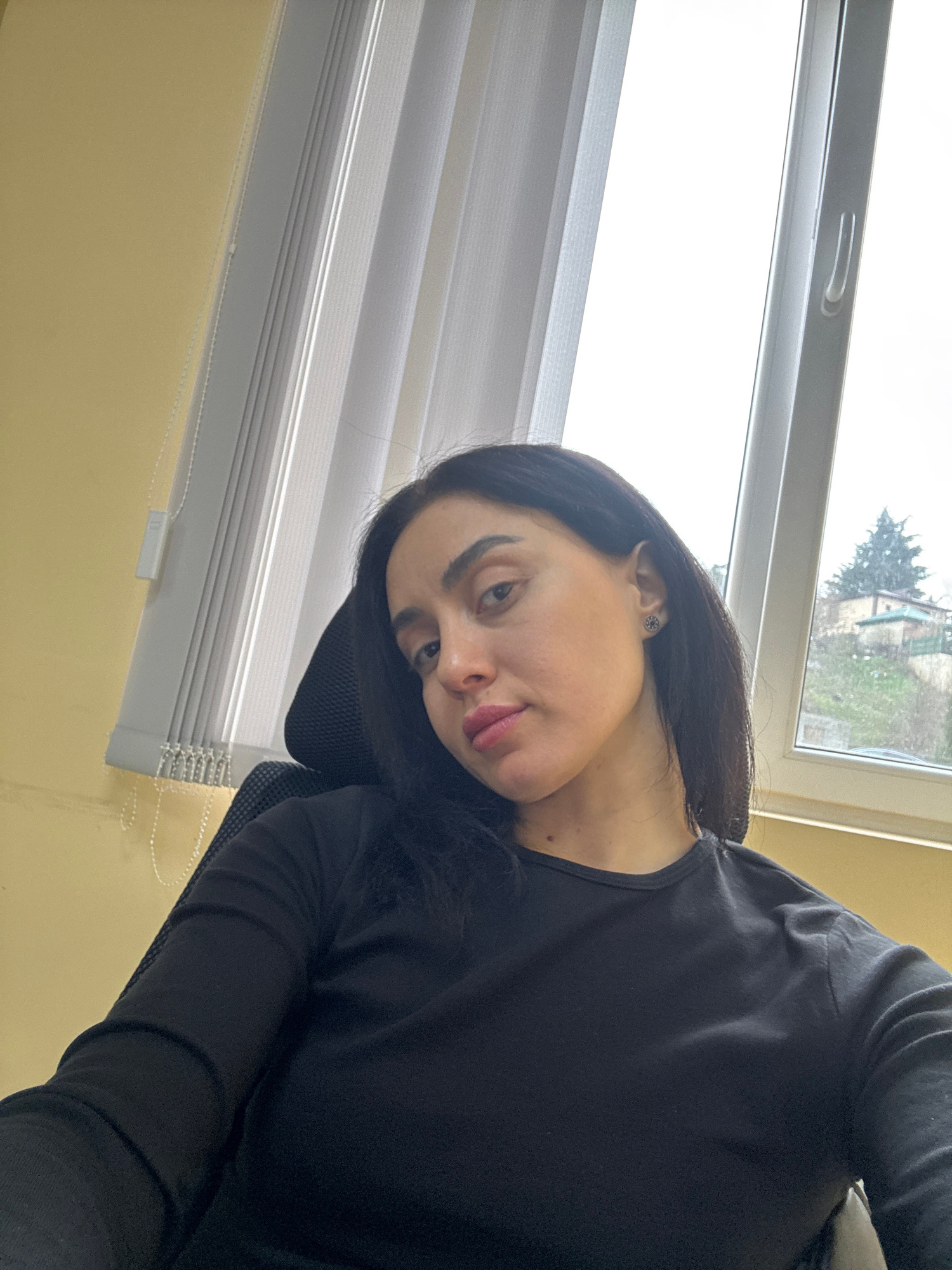The image depicts a person with dark hair and fair skin, wearing a dark long-sleeved shirt. The individual is seated in an office chair, and there is a window with closed blinds to the left. Through t…read more