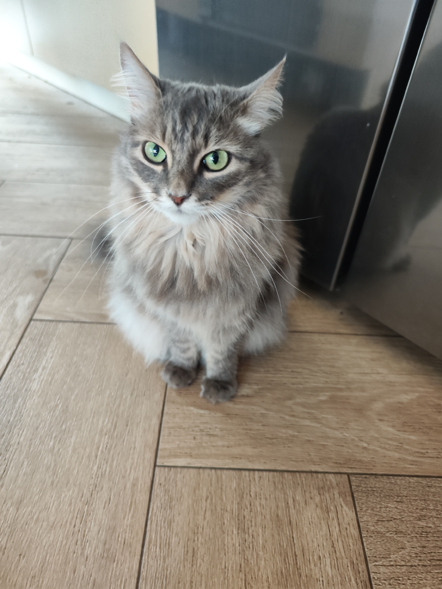 A gray tabby cat with long fur and green eyes is sitting on a light brown wood-look tile floor. The cat is positioned in the lower center of the frame, facing forward. To the right of the cat is a sta…read more