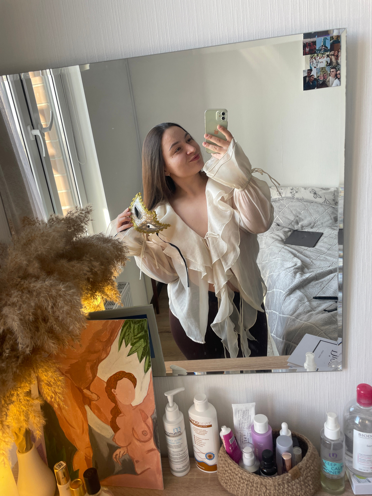 A young woman is taking a selfie in a mirror. She is wearing a white, flowing blouse and holding a white and gold mask. The background shows a bed with gray linens and a tablet on it. To the right of…read more