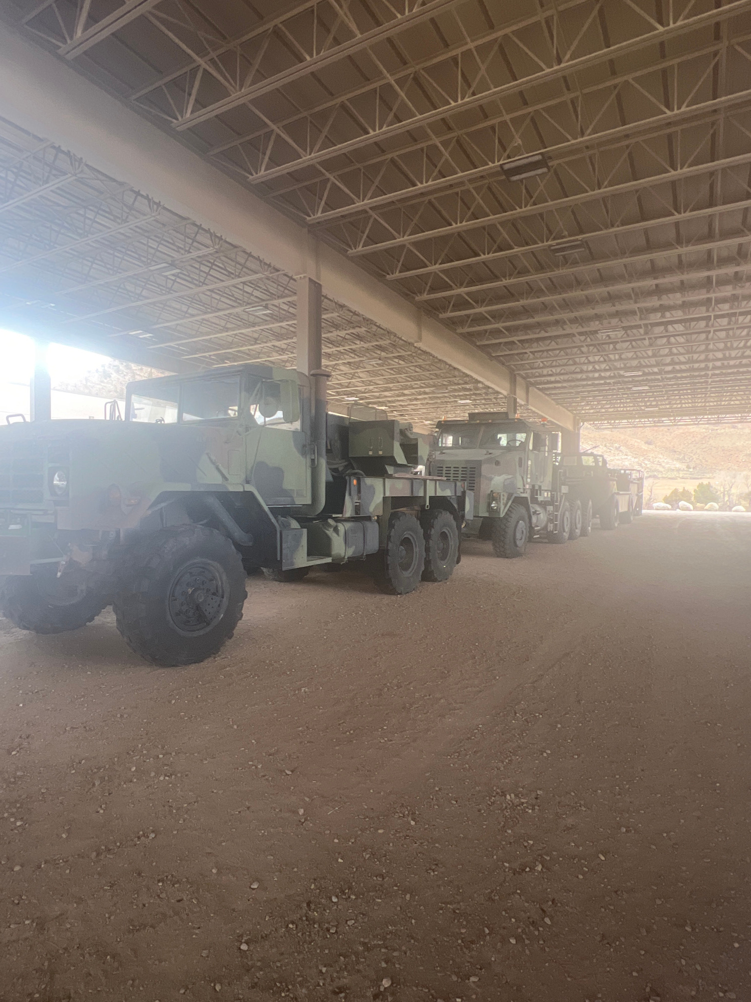 The image shows a series of military vehicles parked inside a large structure with a complex metal roof. The vehicles are in a line, with the front of the line closer to the viewer. The vehicles appea…read more
