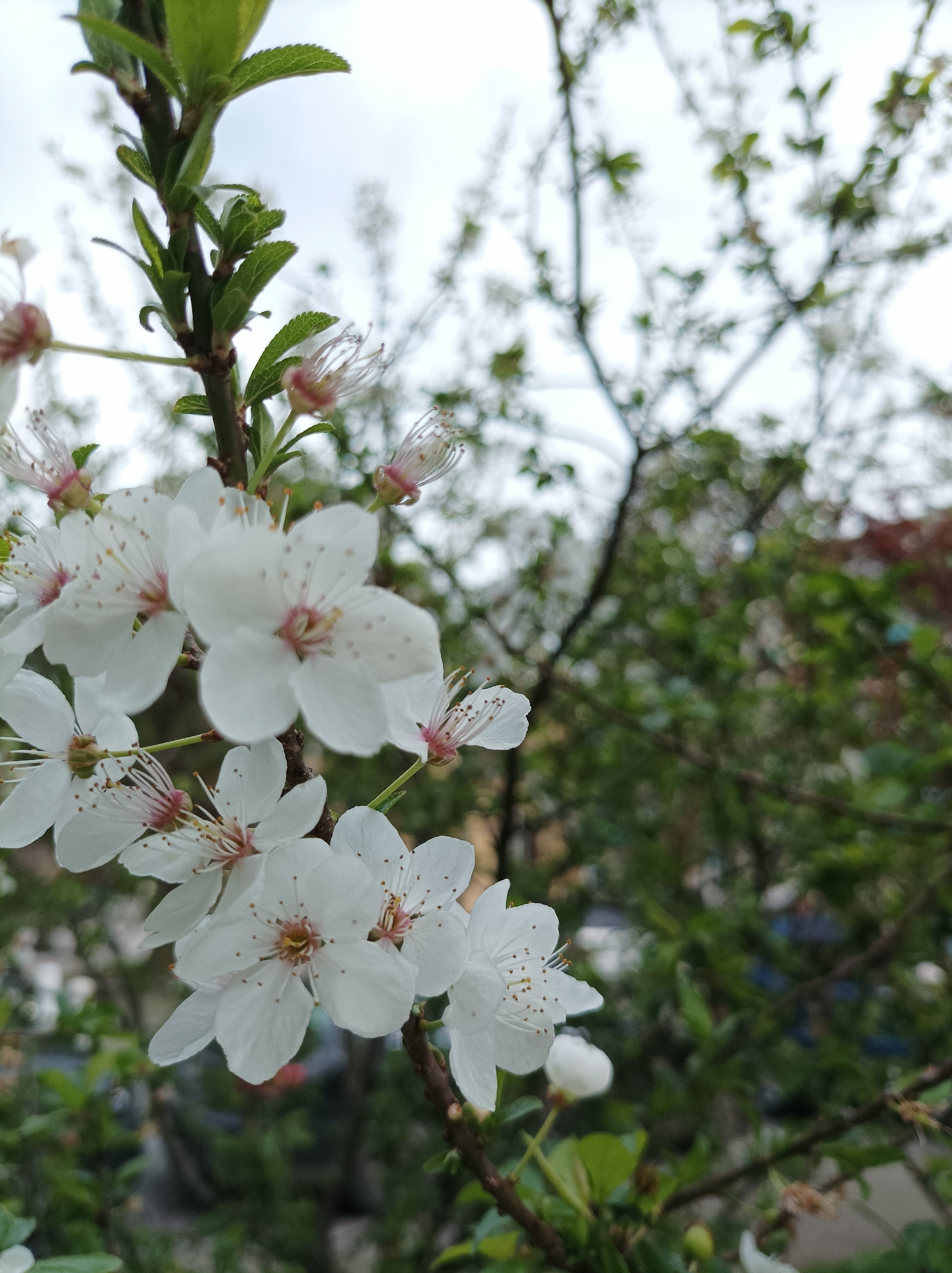 The scene depicts a close-up, upward-angled view of a blooming tree branch in Batumi, Georgia. The primary subject is a cluster of white blossoms, each characterized by five white petals and a central structure featuring numerous light-colored stamens with yellowish tips, originating from a pinkish-red core. Several un-opened buds are visible alongside the mature flowers. Small, serrated, light green leaves emerge from the brown stem supporting the blossoms. The background is significantly blurred, showing indistinct green foliage and tree branches against a diffused, light-colored sky that appears overcast. In the far background, out-of-focus elements suggest distant urban structures, including a muted reddish-brown shape. No identifiable individuals, specific actions, or interactions are discernible within the frame. | Open Wire