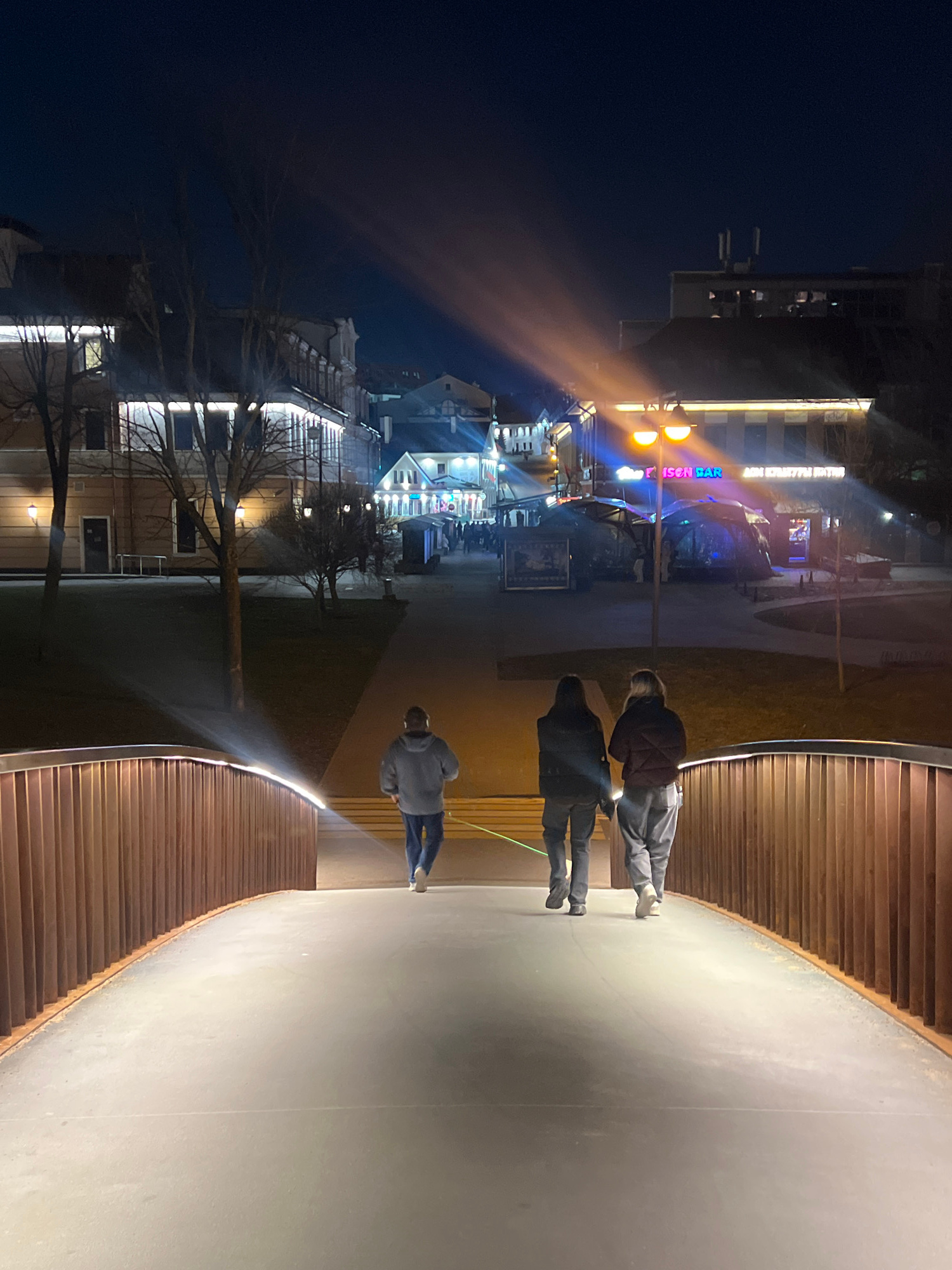 At night, on a curved walkway in Minsk, Belarus, three people are walking. The area is illuminated by lights from buildings, including one with "EISON BAR" signage. The walkway has wooden railings. Th…read more