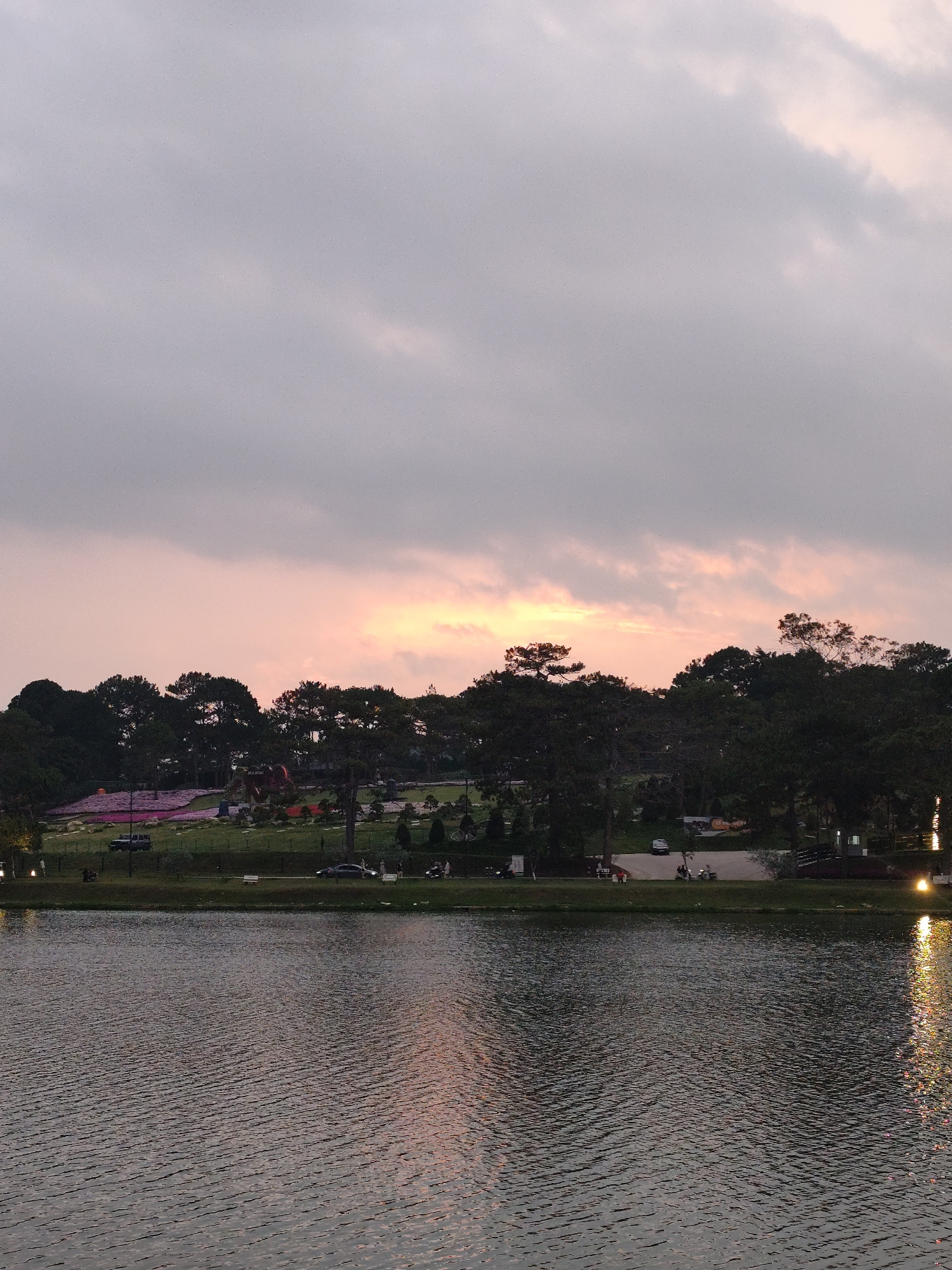 This image captures a tranquil evening scene overlooking a lake towards a beautifully landscaped park or garden, located in Da Lat, Vietnam. The time of day is dusk or sunset, evidenced by the sky's g…read more