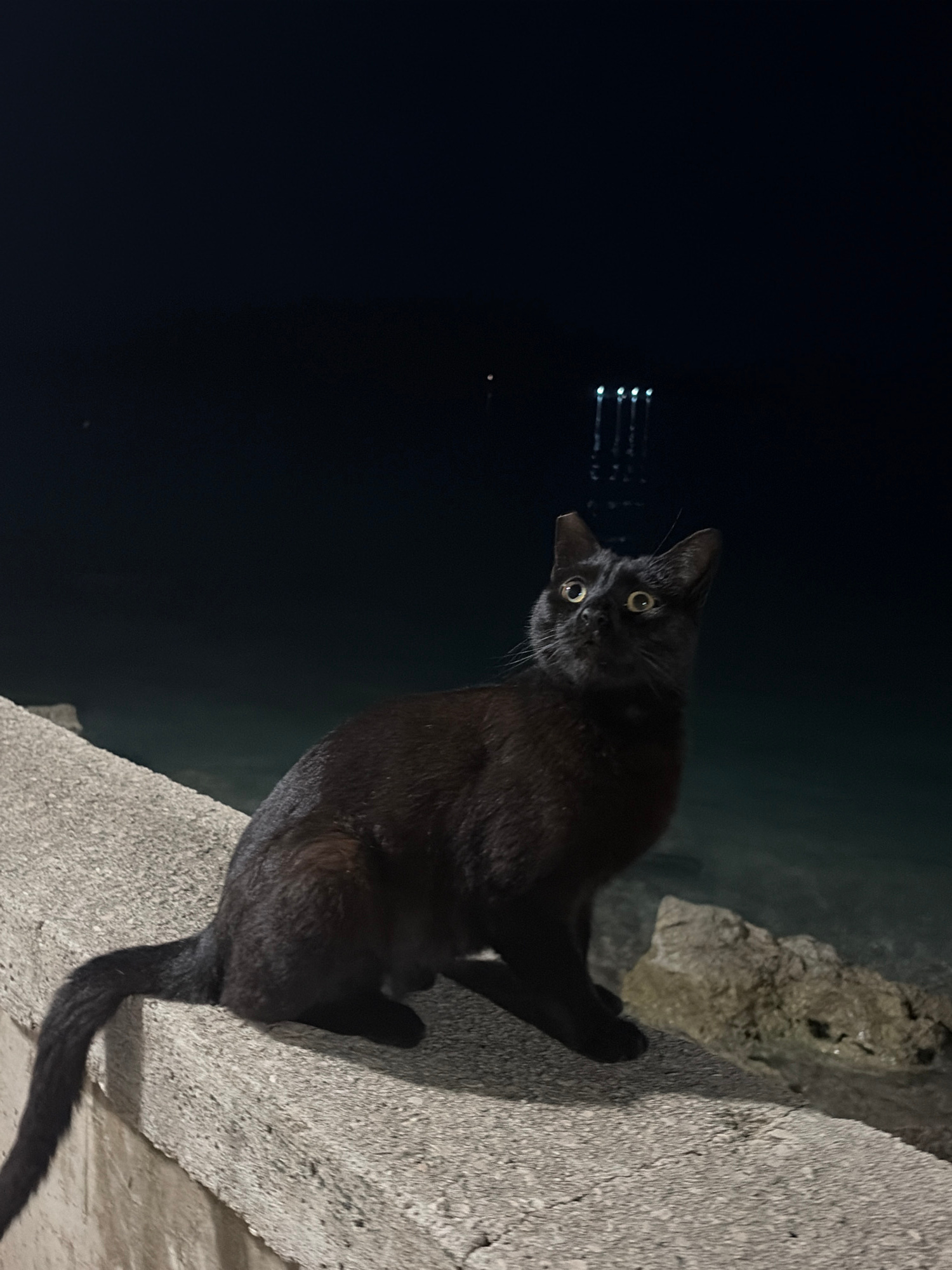 The image displays a black cat at night, perched on a textured concrete ledge or embankment. The cat is the primary subject, looking directly at the viewer with wide, luminous yellowish-green eyes thaβ¦read more