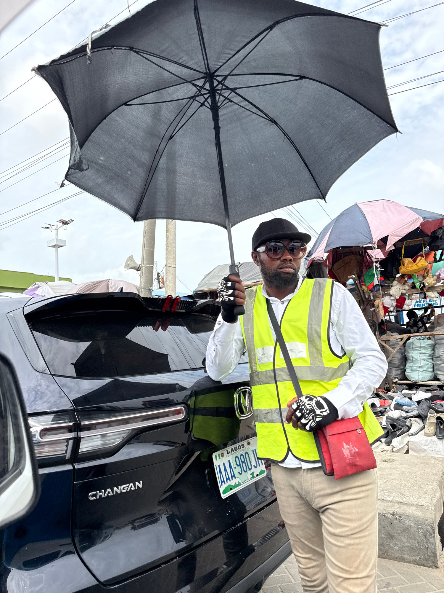 A man in a black hat, sunglasses, white shirt, yellow reflective vest, beige pants, and skull gloves holds a black umbrella. He stands next to a black Changan car with a green and white license plateβ¦read more