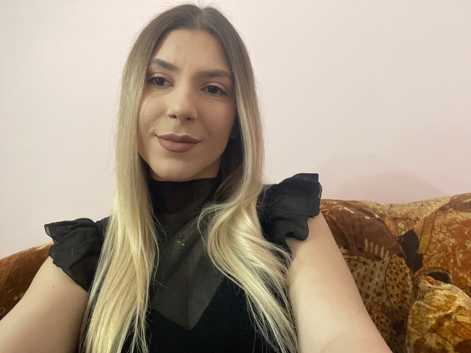 A medium-shot, indoor photograph shows a woman from the chest up, with the image rotated 180 degrees. The woman has fair skin, light brown eyes, and light pink lips. She is wearing a black top that ap…read more