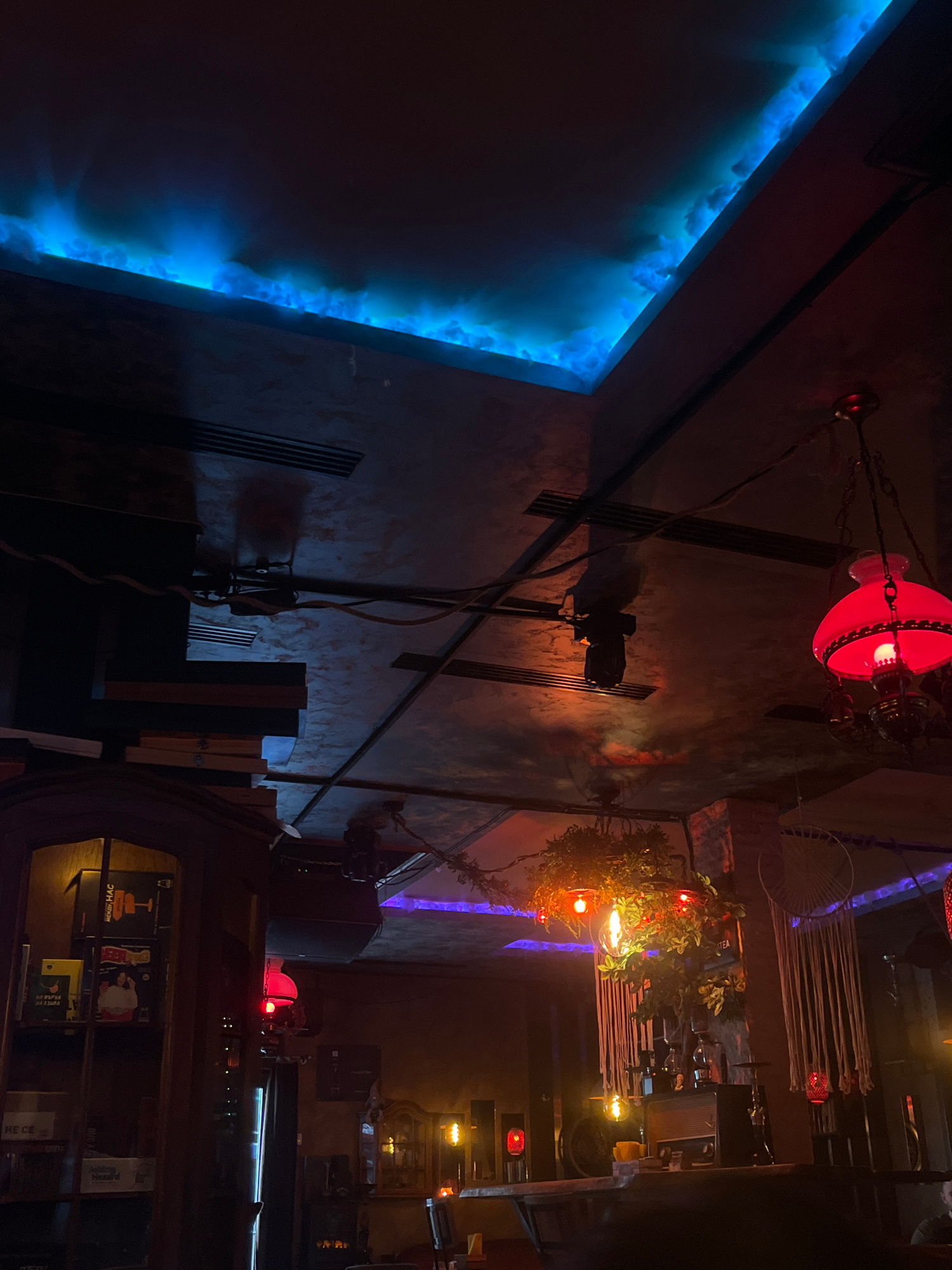 The image captures an interior scene, likely a bar or restaurant in Pleven, Bulgaria, given the likely location. The space is dimly lit, with a mix of artificial lighting that creates a moody ambiance…read more