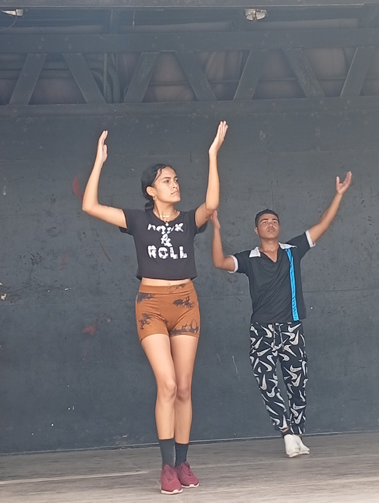 Two individuals are captured in a photograph in what appears to be Playa El Agua, Venezuela. The foreground is filled by a light-colored wooden surface, perhaps a stage or platform. Behind this, a dar…read more