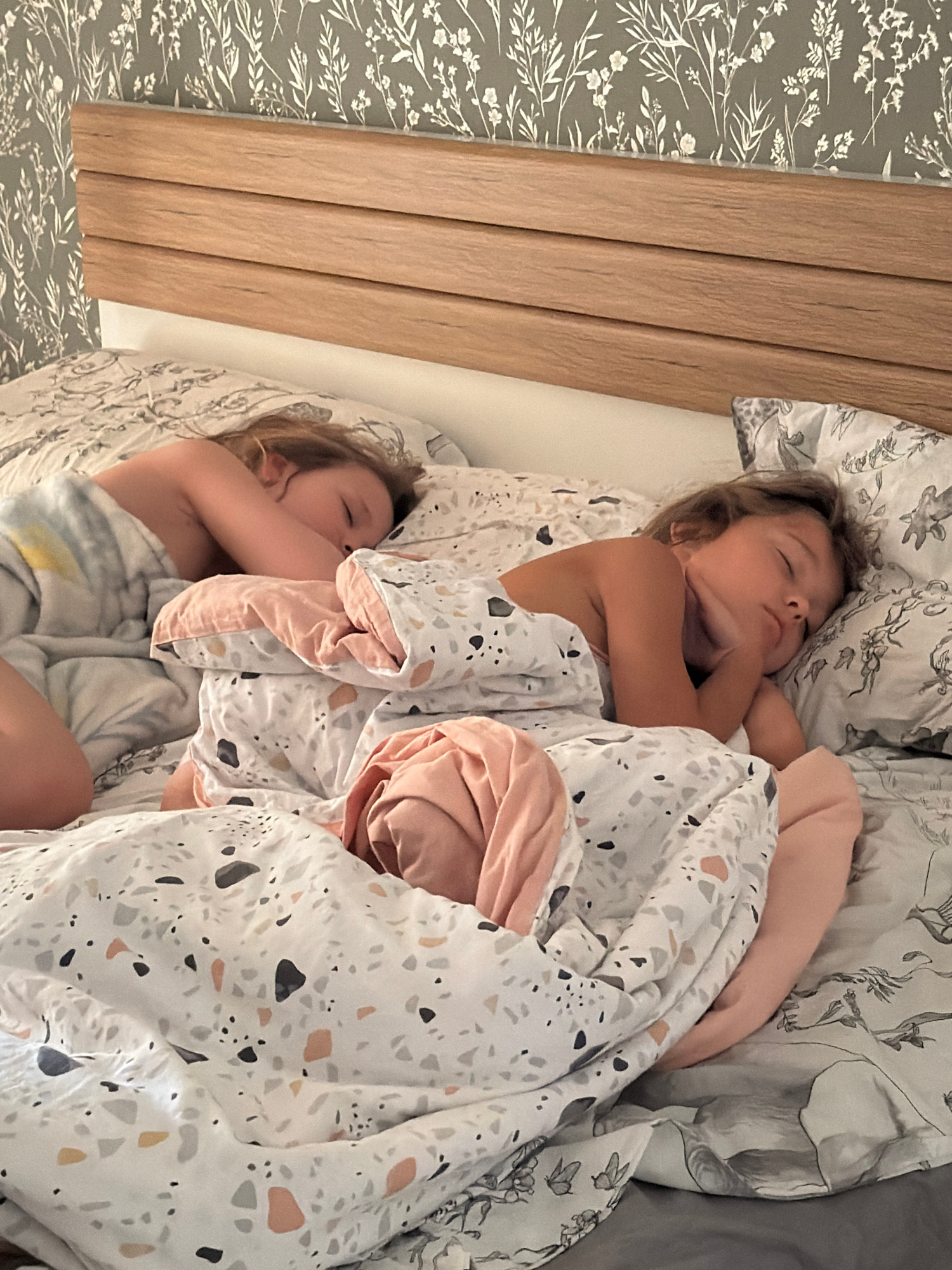 Two children are sleeping in a bed. One child is on the top, curled up with their arms around their head. The other child is below, also curled up. They are covered with a patterned blanket and a pink…read more