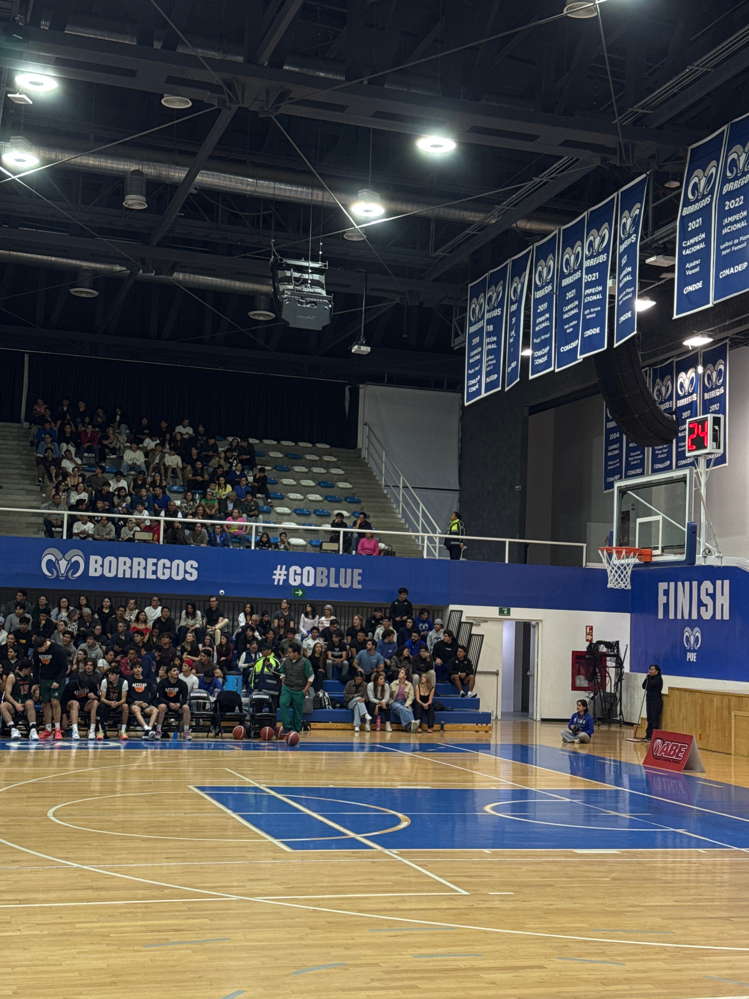 The image is an angled, indoor shot of a basketball game with spectators in bleacher seating. Banners hang from the ceiling, displaying sports achievements. The basketball court has blue markings and…read more
