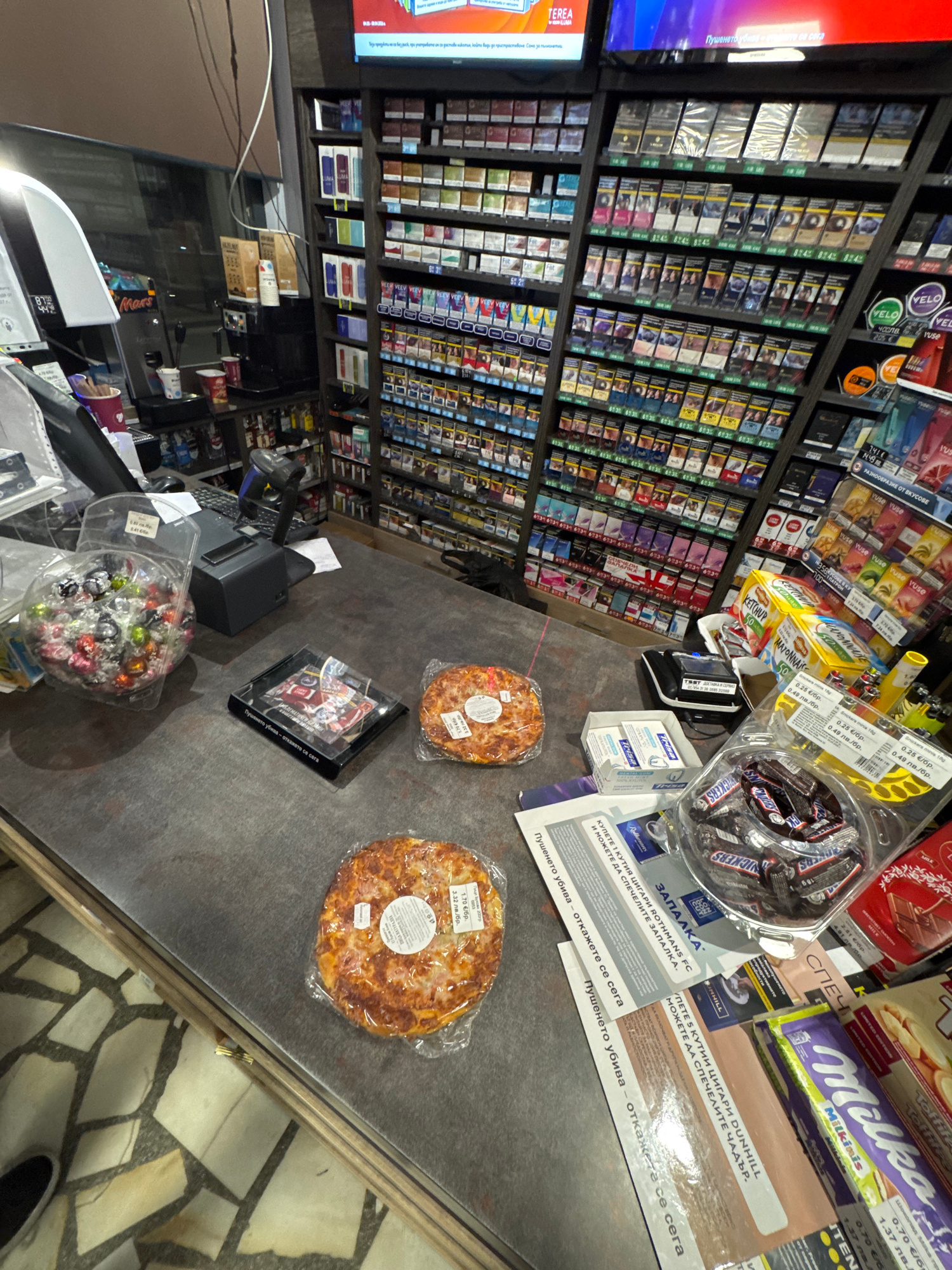 The image depicts a store counter in what appears to be a convenience store or small supermarket, possibly located in Smolyan, Bulgaria given the Bulgarian text visible on various product packaging an…read more