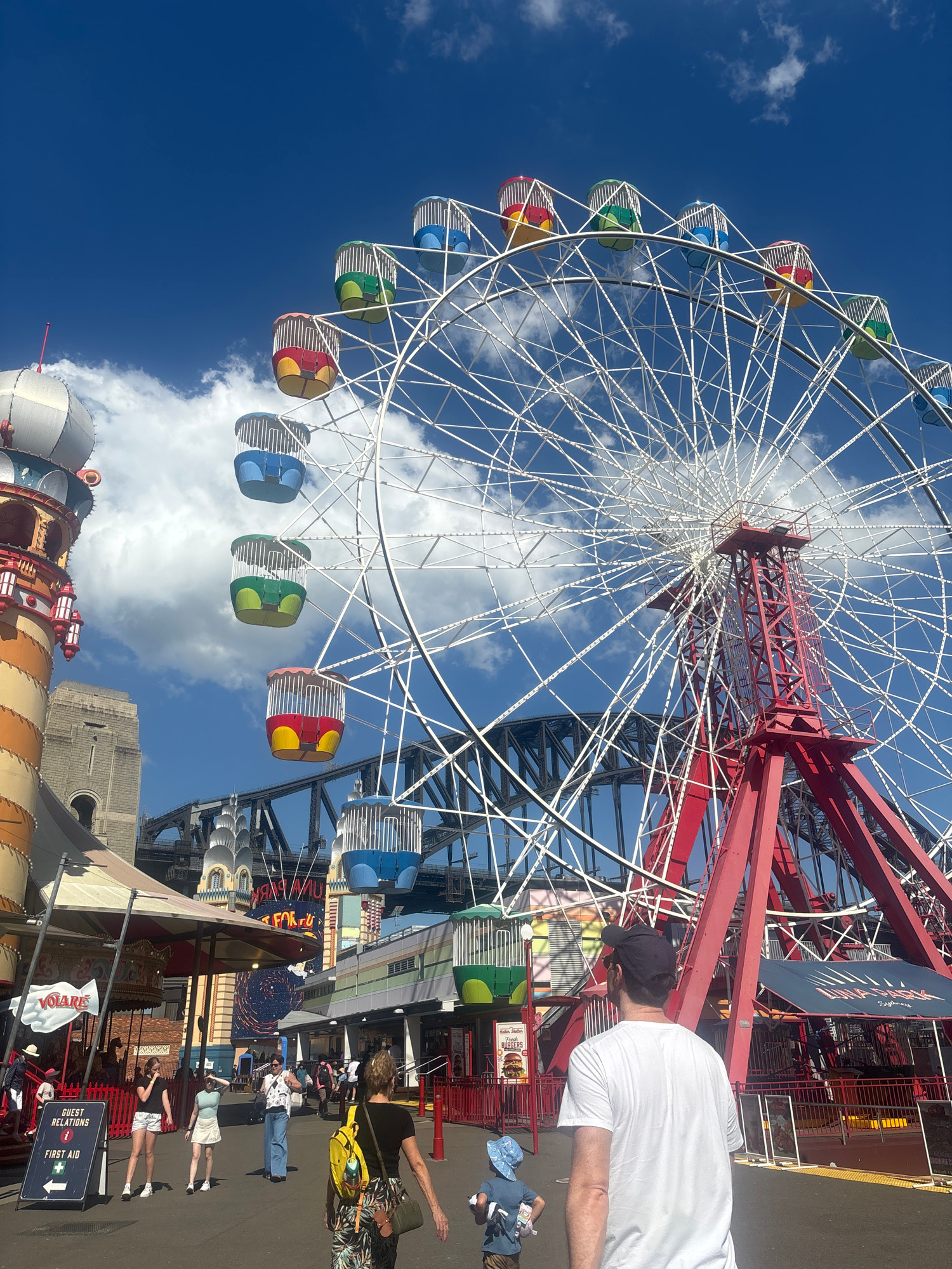 The image features the Ferris wheel and other attractions at Luna Park Sydney, located in Milsons Point, Australia. The Ferris wheel has colorful gondolas and a white lattice structure, with a red sup…read more