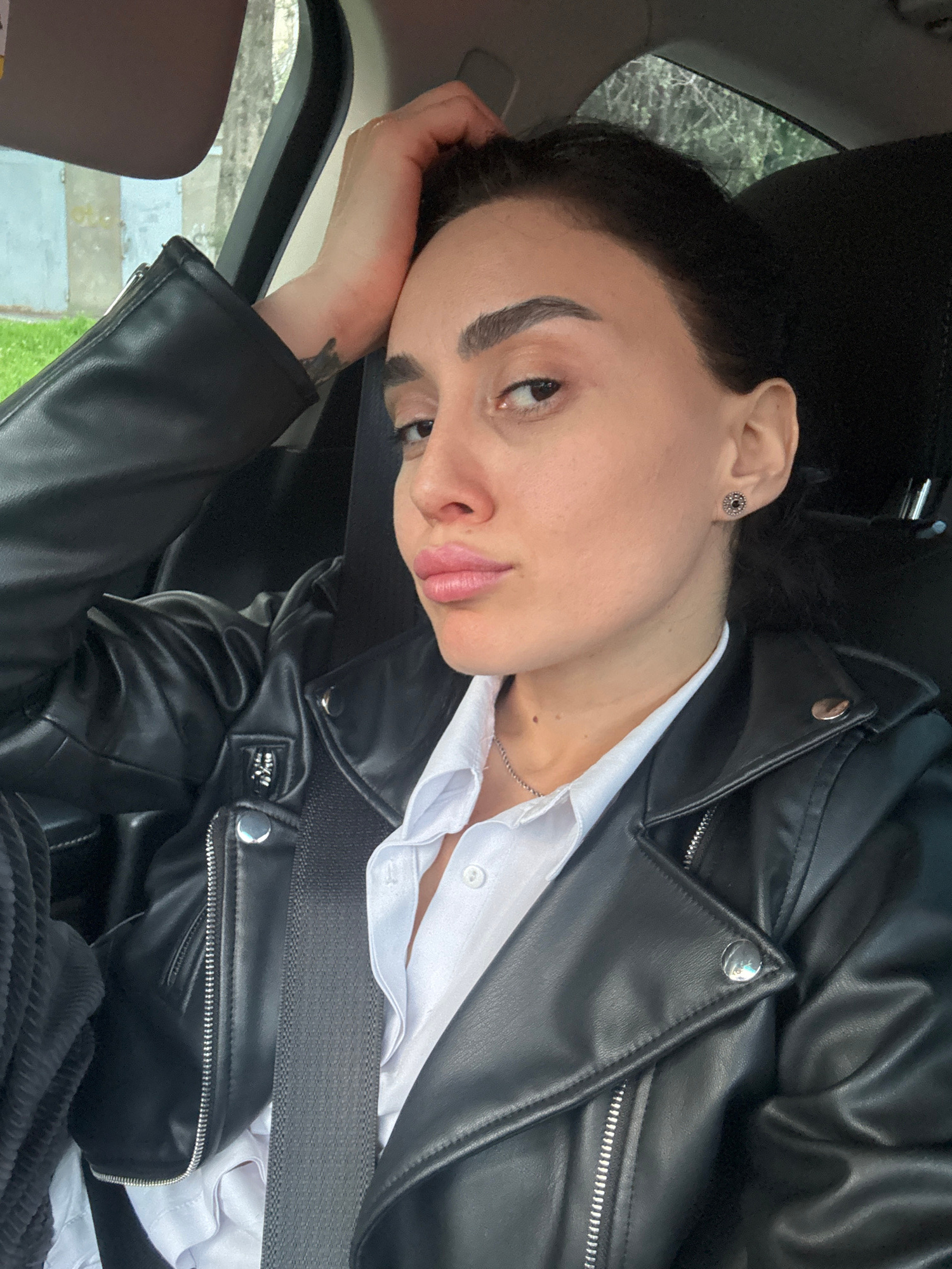 A woman is in a car wearing a black leather jacket over a white button-down shirt, with a black seatbelt across her chest. She is resting her head on her hand. The car appears to be parked; the backgr…read more