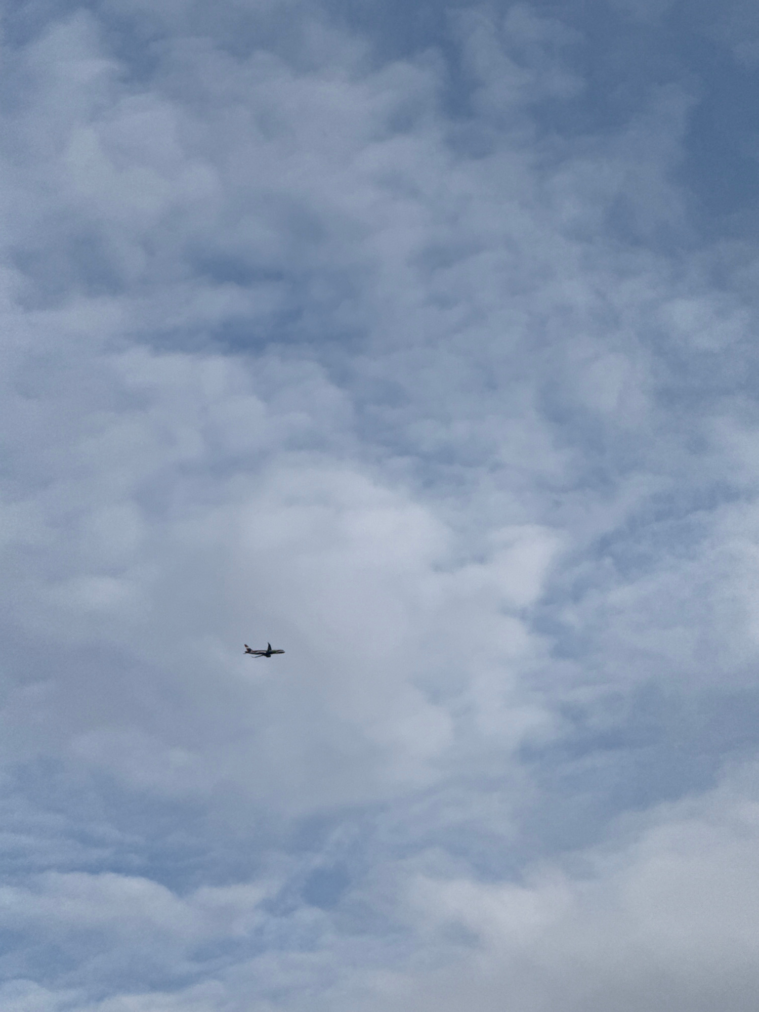 The image shows a blue sky filled with puffy, white clouds. A small, dark airplane is visible in the center of the frame. The location of the city of Riga, Latvia is not discernible from the content o…read more