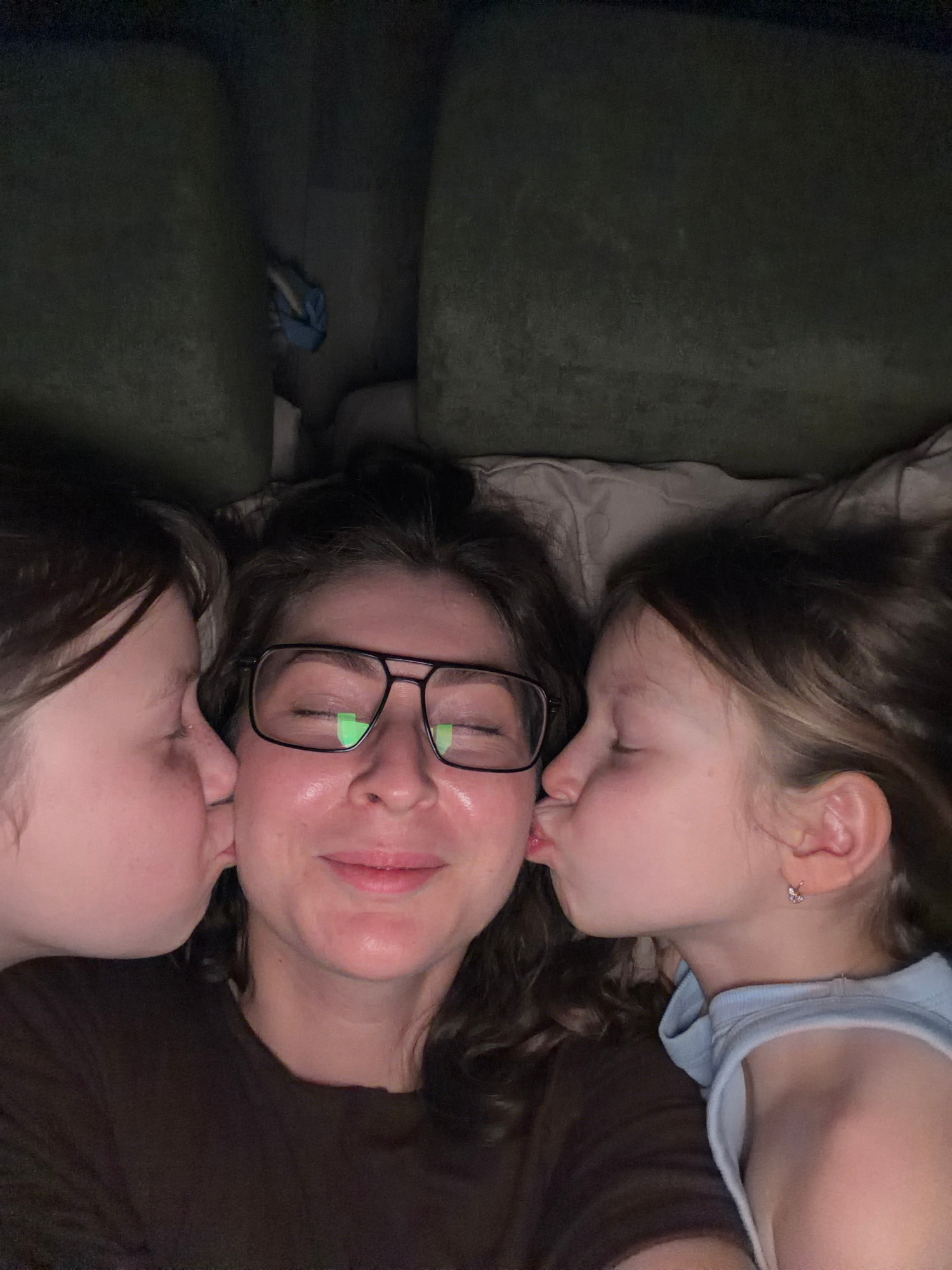 The image shows a woman wearing glasses lying down, with two young children lying on either side of her, kissing her cheeks. The scene appears to be indoors, possibly on a couch, as suggested by the g…read more