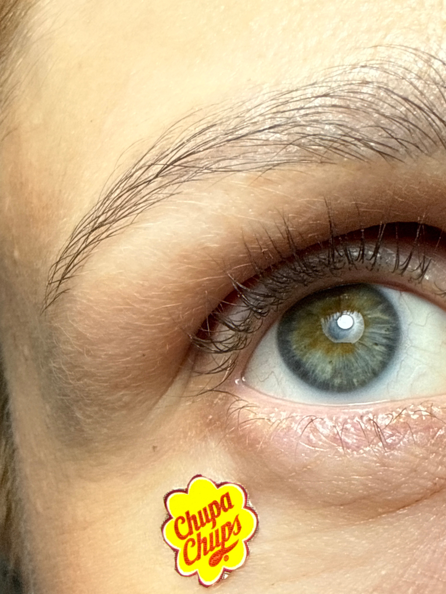A close-up image focuses on a human eye with light green and yellow irises. The eye is surrounded by dark eyelashes and an eyebrow. Adhered to the skin below the eye is a yellow Chupa Chups brand stic…read more