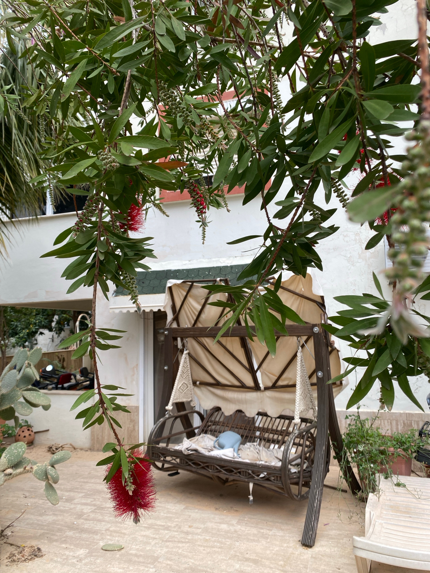 The image shows a Callistemon tree with its distinctive red flowers in the foreground, partially obscuring a view of an outdoor patio area. A wicker swing chair with a canopy sits in the patio, with a…read more