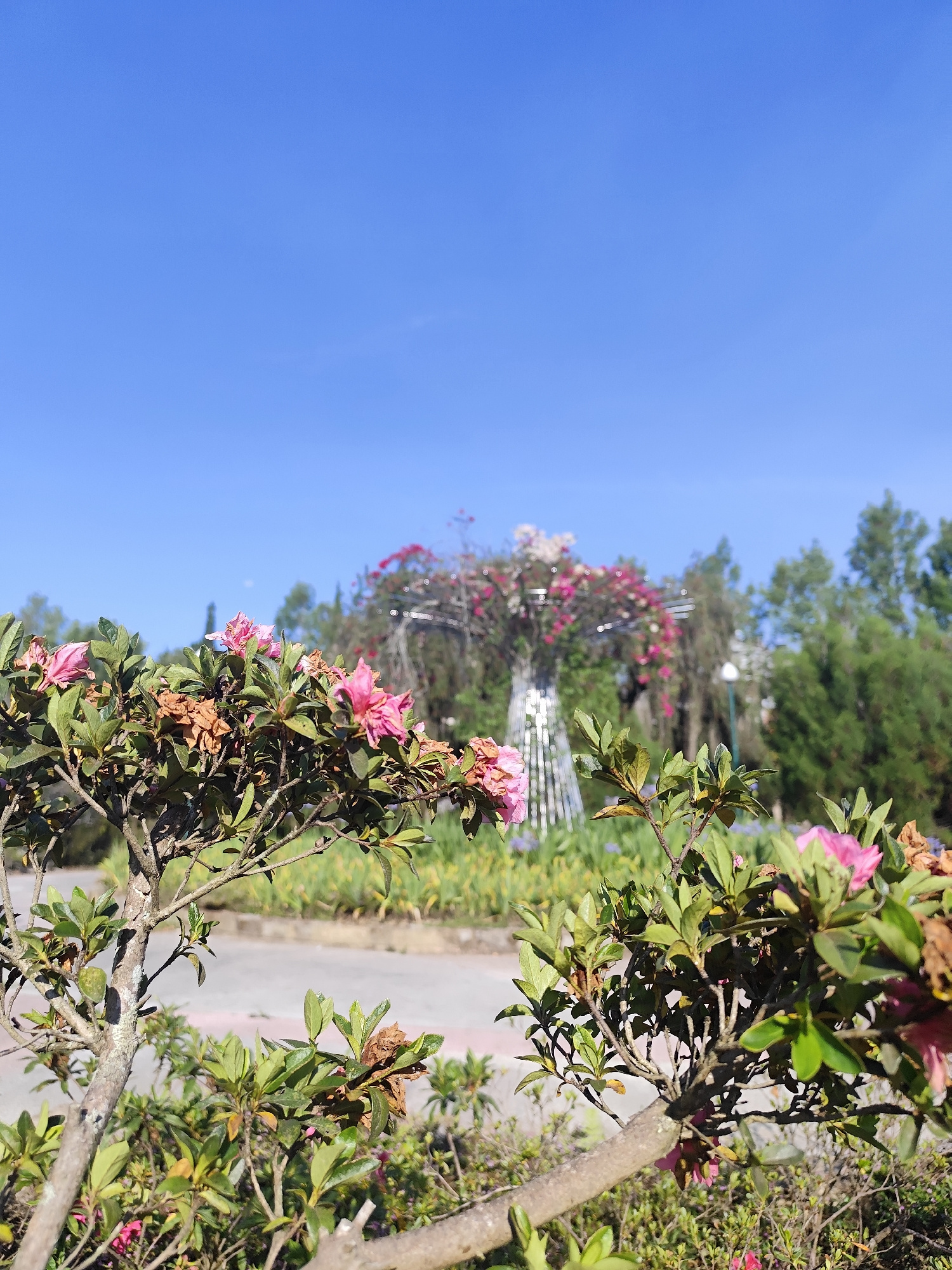 The image shows a shrub with pink flowers in the foreground, partially obscuring a distant metal sculpture adorned with pink and white flowers. The background includes greenery and a clear blue sky. T…read more