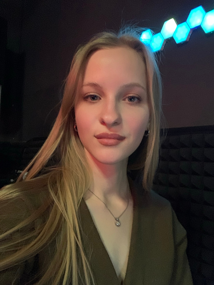 The image shows a young adult female with long, straight blonde hair, fair skin, and blue eyes. She is wearing a dark, possibly olive green or dark brown, V-neck garment and a silver-colored necklace with a small, clear pendant. Her lips appear to have a natural-colored lip product applied. She is positioned centrally, looking directly at the camera. The background is dark. To her right, a dark wall is visible, covered with black acoustic foam panels featuring a pyramidal or wedge pattern. Above and behind her head, a curved arrangement of hexagonal LED light panels emits blue and white light. The lighting in the scene is dim, with light primarily illuminating her face from the front and the blue/white light from the hexagonal panels. No specific visual identifiers within the image directly indicate a location within the city of Kyiv, Ukraine; the environment appears to be an indoor space such as a recording studio or a room with soundproofing. | Open Wire