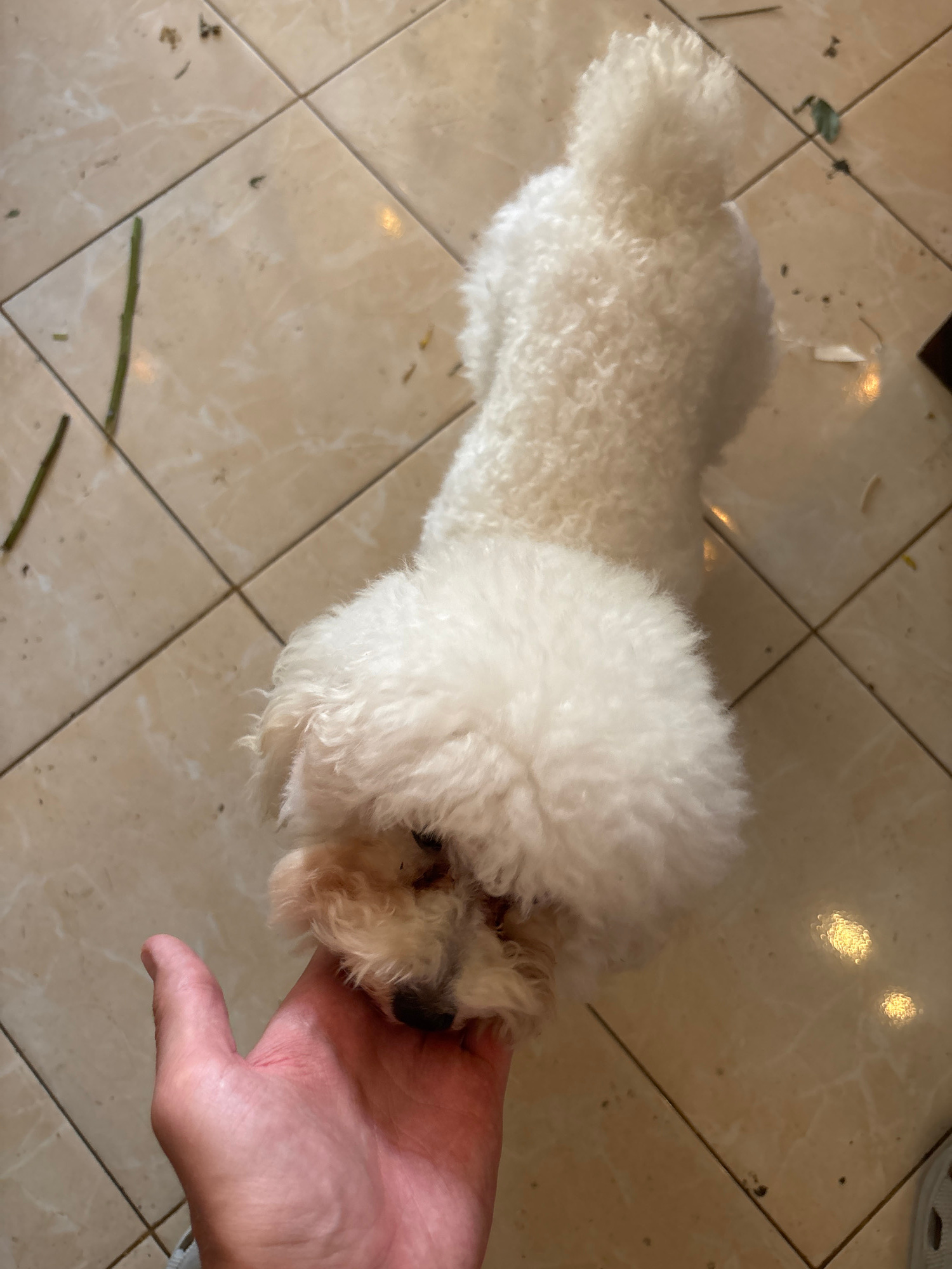 A small, white, fluffy dog lies on a tiled floor in what appears to be an indoor setting. A hand is gently placed on the dog's head. Scattered on the floor are small pieces of debris, possibly leaves…read more