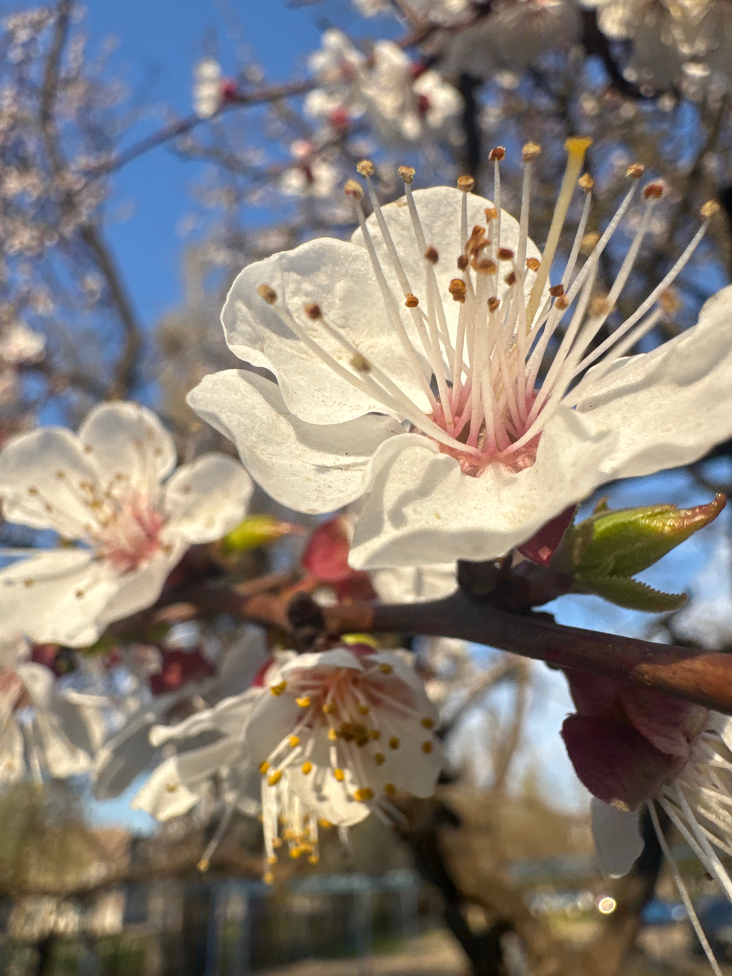 The image captures a close-up view of apricot blossoms. The flowers exhibit delicate white petals surrounding a cluster of light pink stamens. The background includes a bright blue sky, along with add…read more