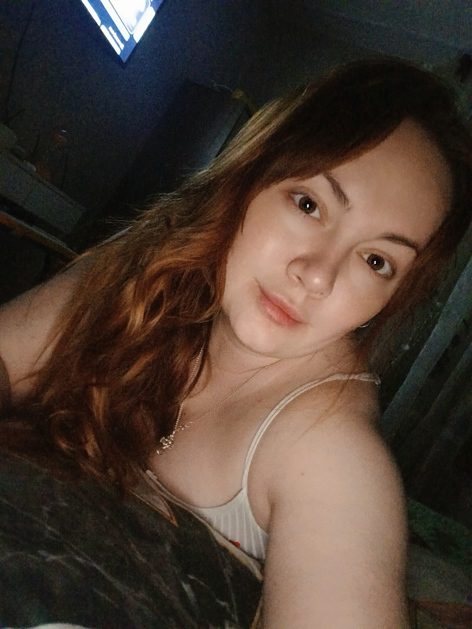 A woman with reddish-brown hair is taking a selfie. She is wearing a white tank top and a silver necklace. The background is dark and indistinct, but there appears to be a television screen visible in…read more