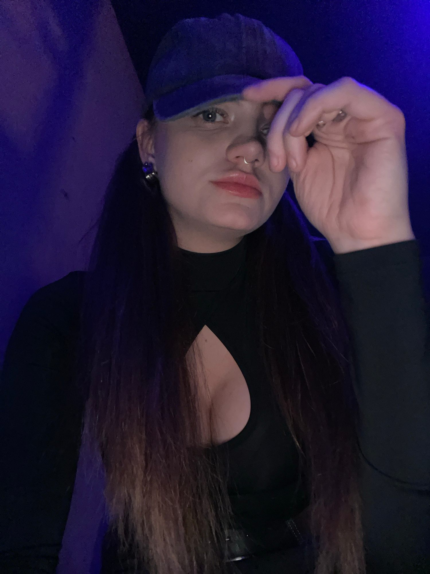 A female subject is depicted in a close-up, selfie-style photograph, taken in a dimly lit indoor environment with a distinct blue-purple ambient light source illuminating the left side of the frame. Sā¦read more