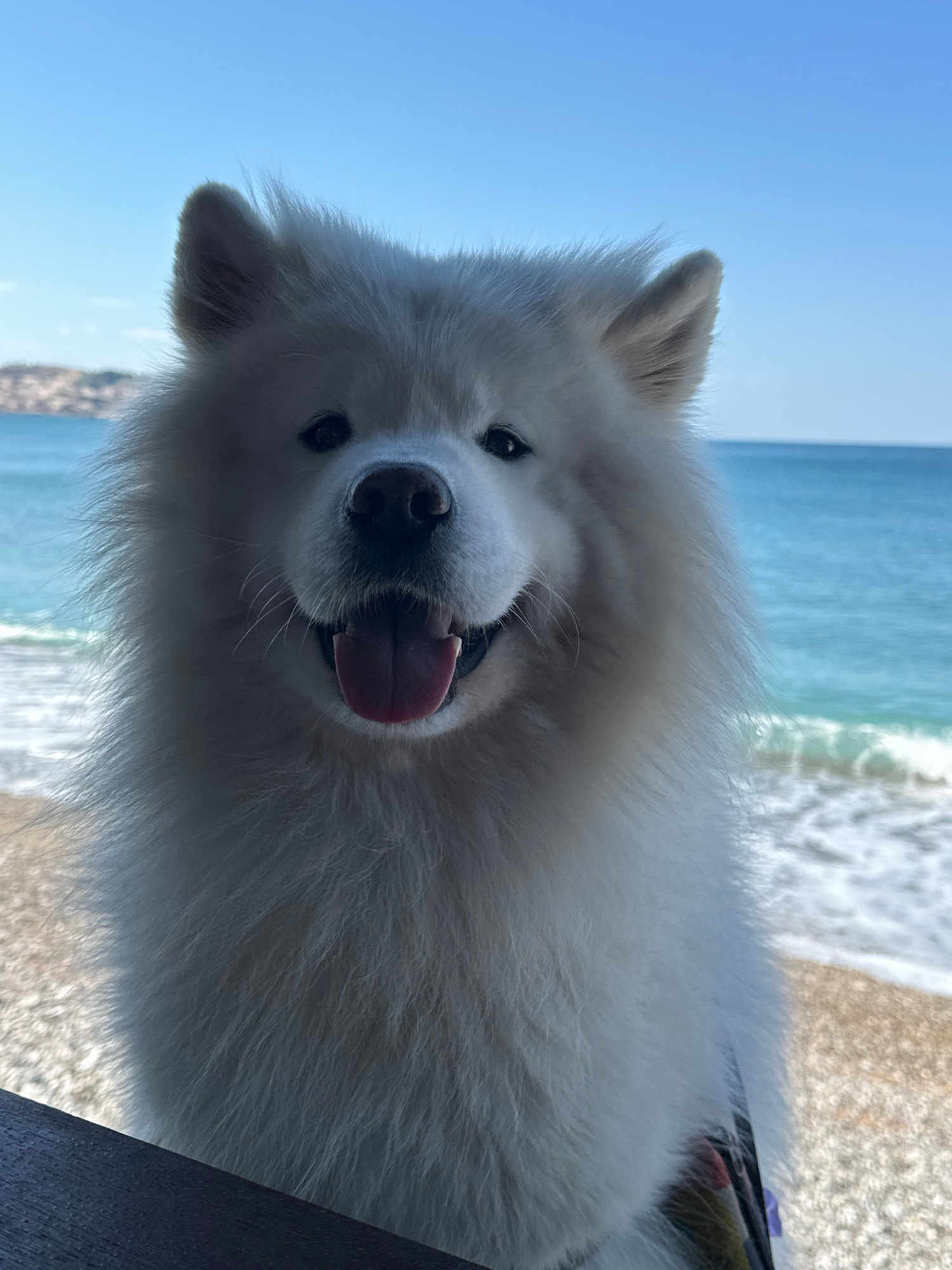 A Samoyed dog is shown, facing the viewer with its tongue out. The backdrop indicates an outdoor setting, probably a beach, evidenced by the sea, beach, and blue sky. The location is likely in Bar, Mo…read more