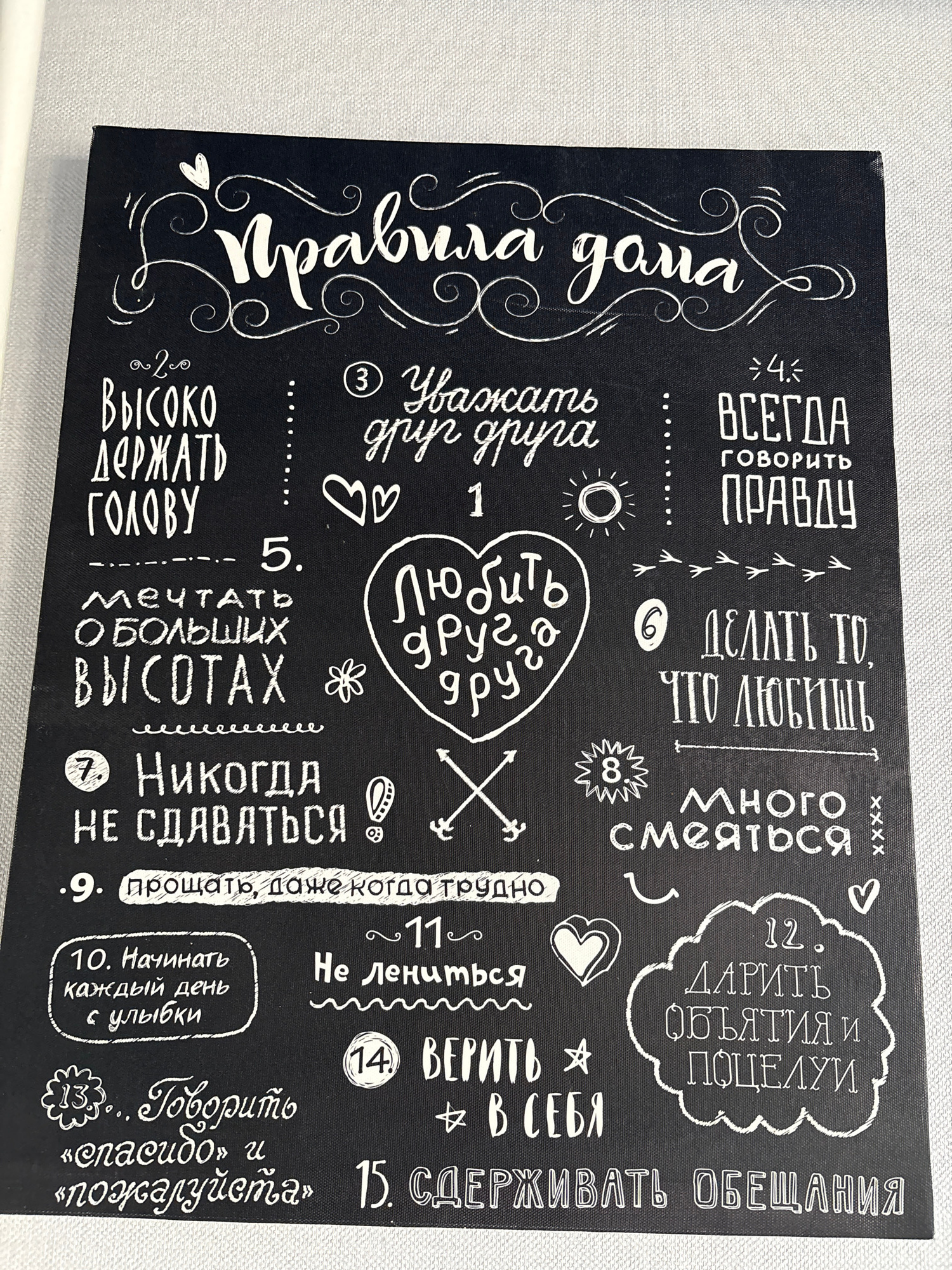 Here is a detailed description of the image: The image shows a dark background with white lettering, appearing to be a set of rules or guidelines written in Russian. The text is stylized with decorat…read more