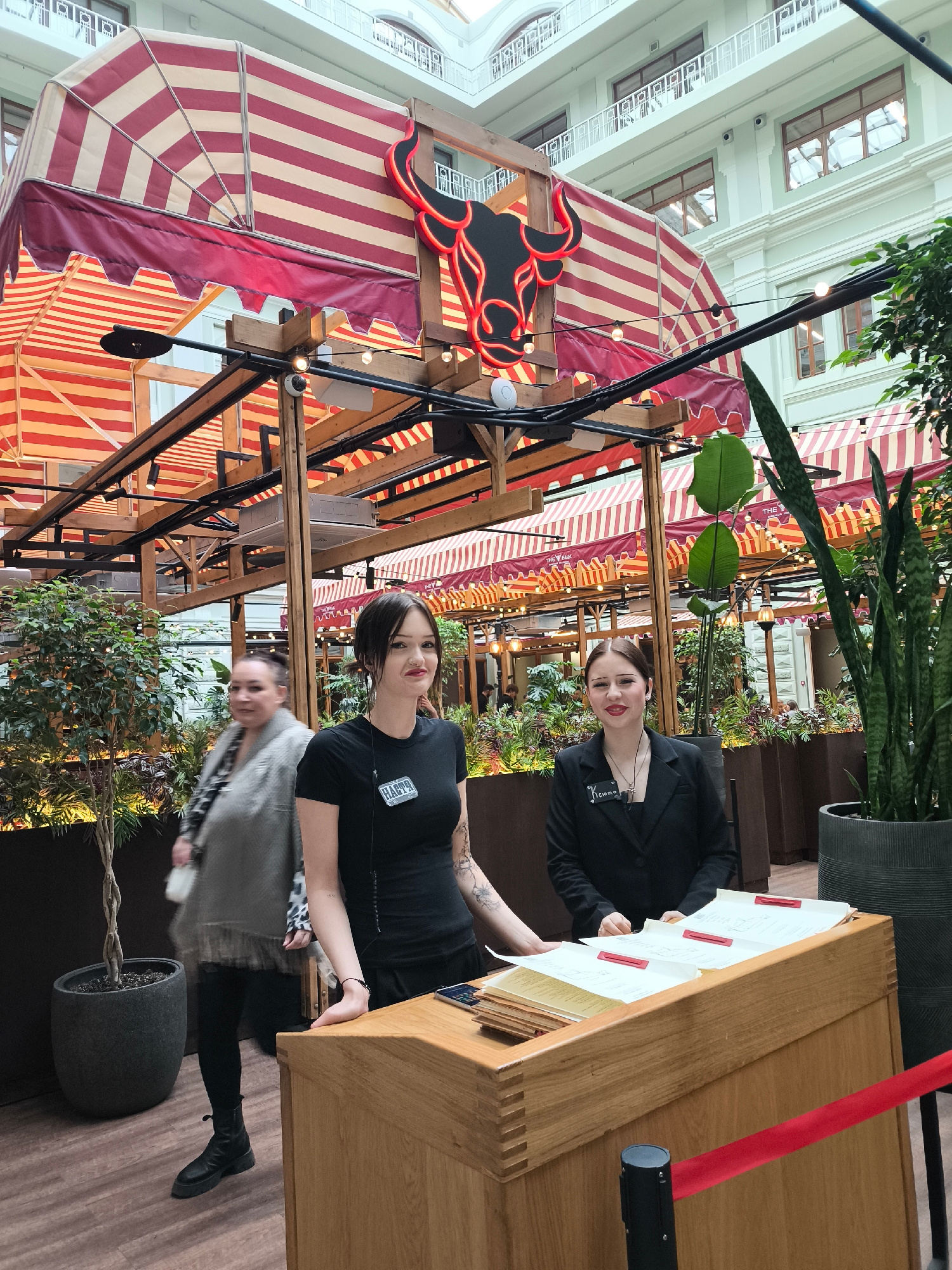 The image depicts an indoor setting, possibly a restaurant or event venue, characterized by a blend of industrial and natural elements. Two young women stand behind a wooden reception desk, likely act…read more
