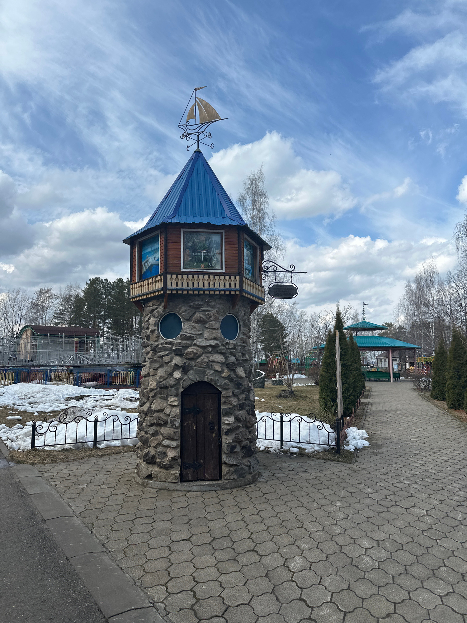 This media file depicts a charming, tower-like structure in an outdoor park or recreational setting in Chaikovsky, Russia, under a cloudy but bright daytime sky. The structure has a rustic aesthetic,…read more