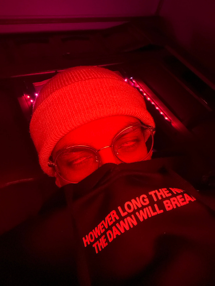 A person with closed eyes wearing a beige beanie and round glasses is illuminated by red light. They are wearing a dark sweatshirt with the words "HOWEVER LONG THE DAWN WILL BREAK" printed in red. Red…read more