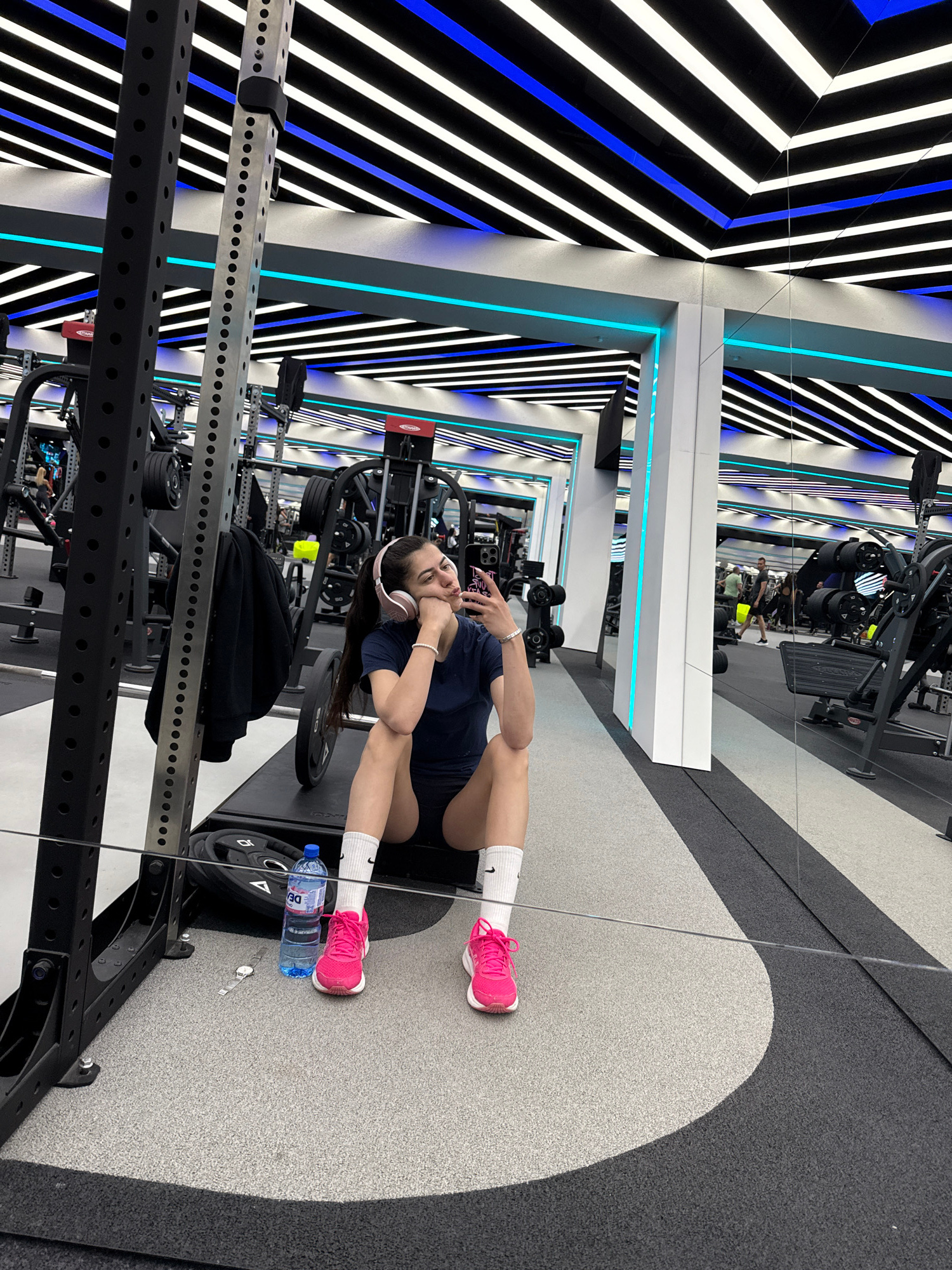 A woman is sitting on the floor in a gym, taking a selfie. She is wearing a navy blue t-shirt, black shorts, white socks, and pink sneakers. She has headphones on. Next to her is a water bottle and a…read more