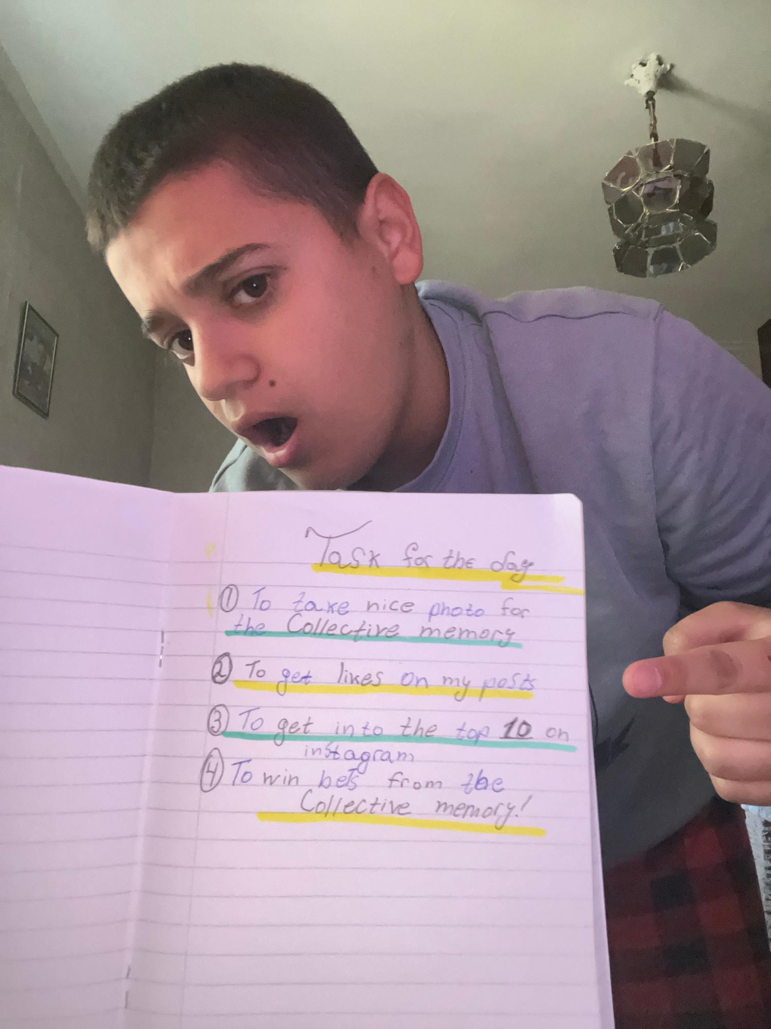 An indoor scene in Lozarevo, Bulgaria, features a young man presenting a handwritten list in a notebook. The man, with short dark hair and dark eyes, is positioned on the left, looking at the camera w…read more
