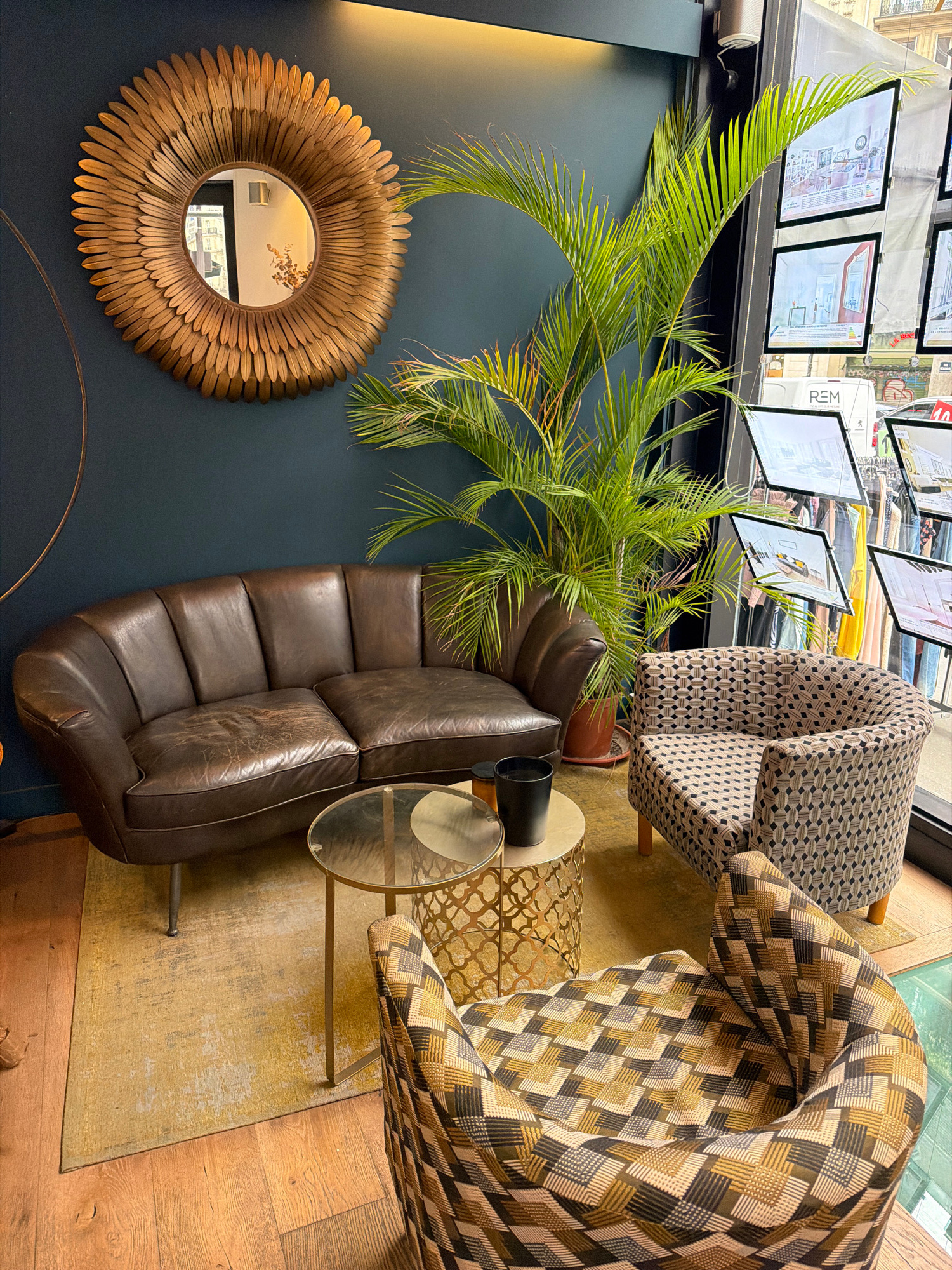 The image is an overhead shot of a room with a contemporary interior design. The scene includes a brown leather sofa, two patterned armchairs, a round coffee table, and a large palm plant. A circular,…read more