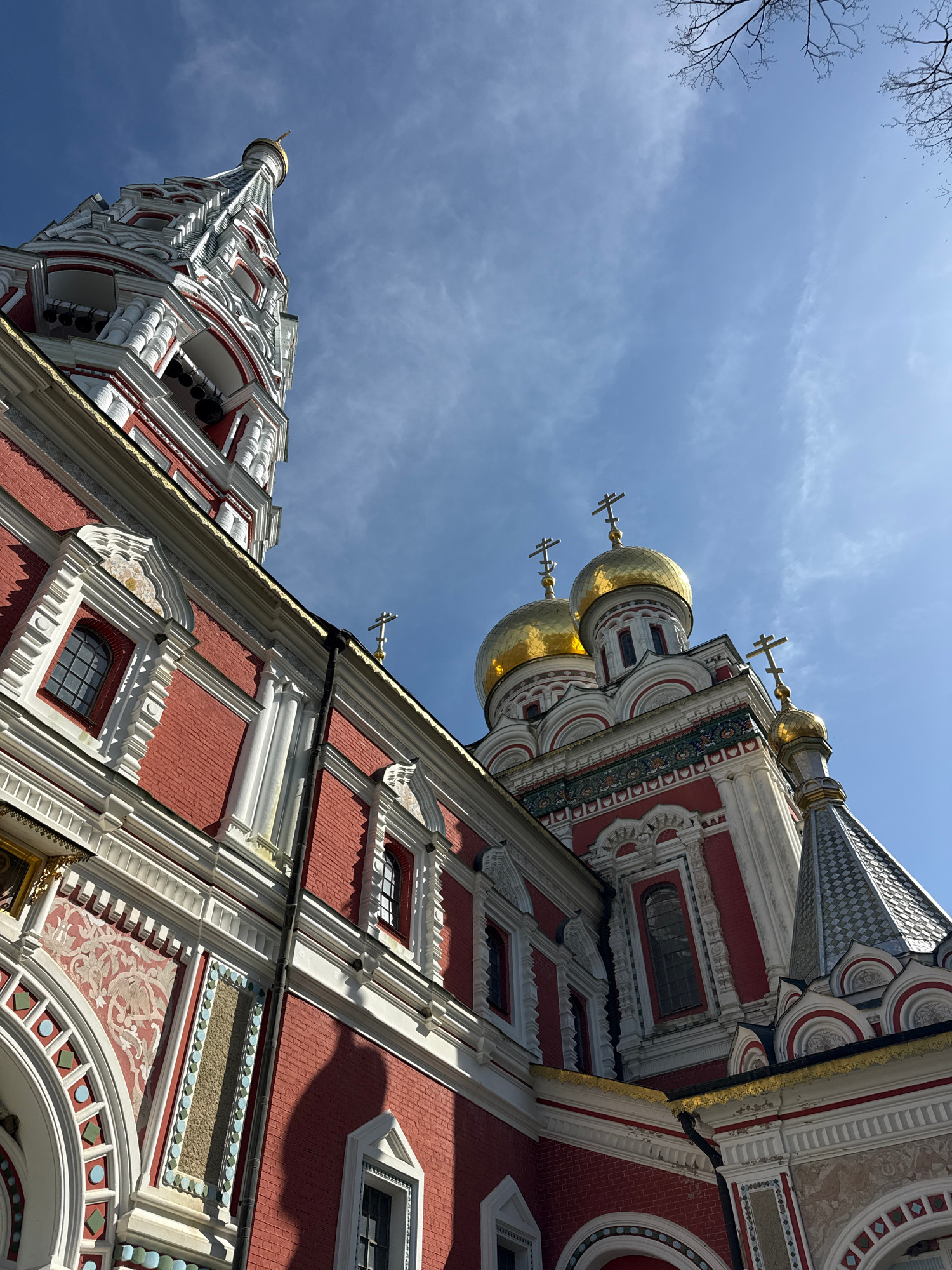 This media file captures a low-angle view of a grand and ornate building, characteristic of an Eastern Orthodox church or memorial. The primary subject is the building, dominated by vibrant red brick…read more