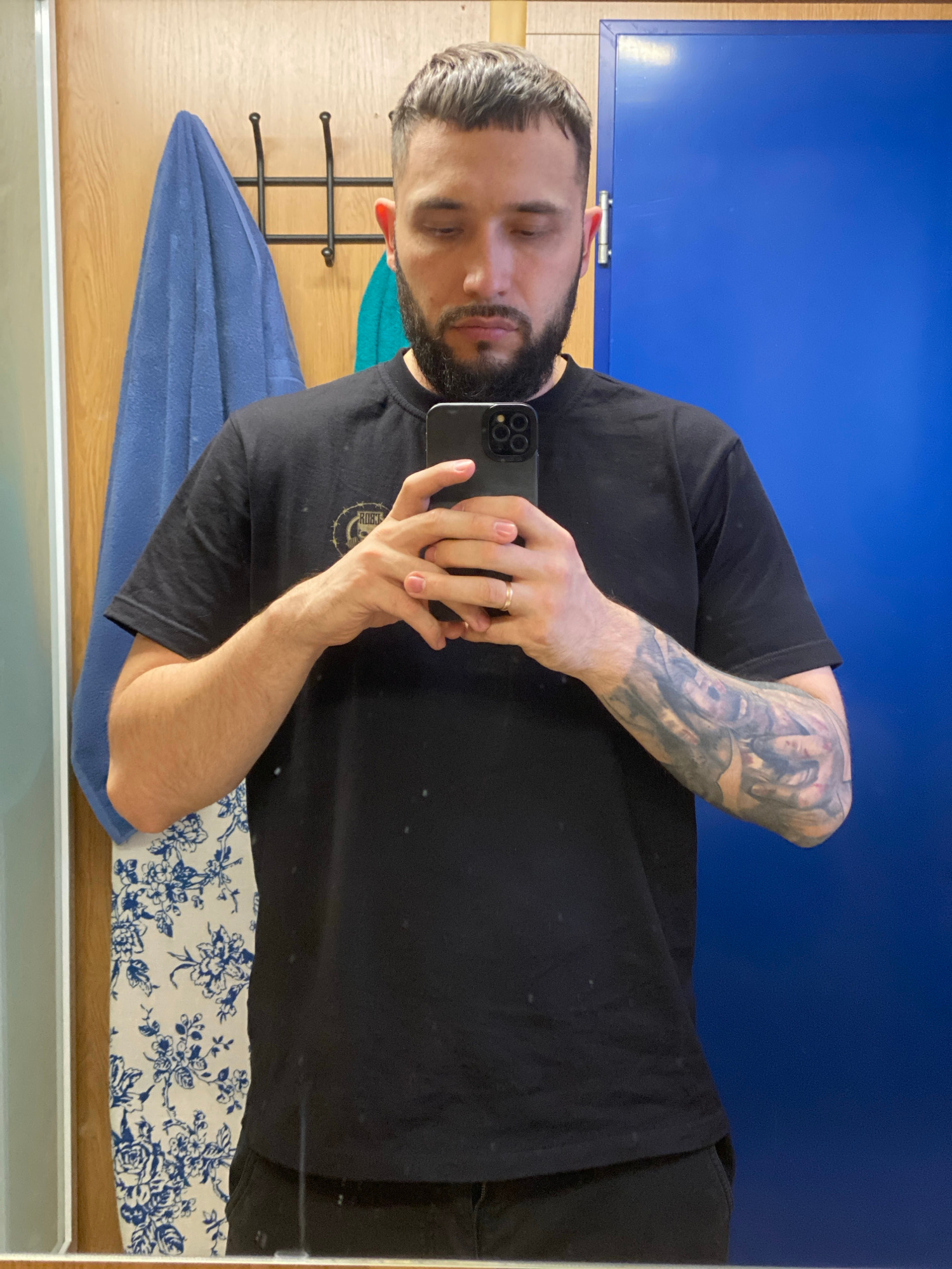 A man is depicted from the chest up, reflected in a mirror while taking a selfie. He has short, dark hair with graying strands on top, and a dark beard and mustache. His eyes are closed or looking dow…read more