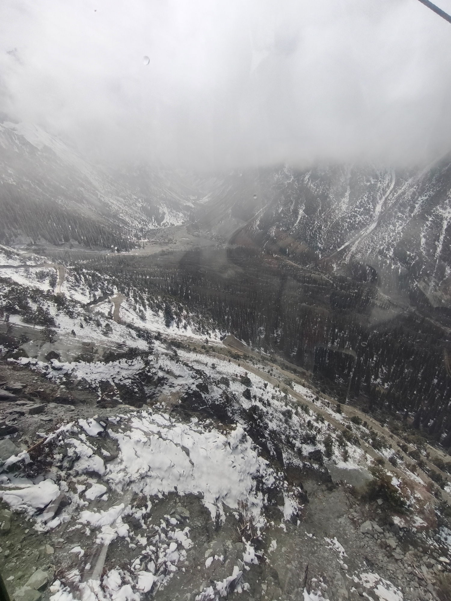 The image depicts a mountainous landscape in a valley in Unknown, Kyrgyzstan, viewed from an elevated perspective, possibly from inside a cable car or similar enclosed structure. The scene is shrouded…read more