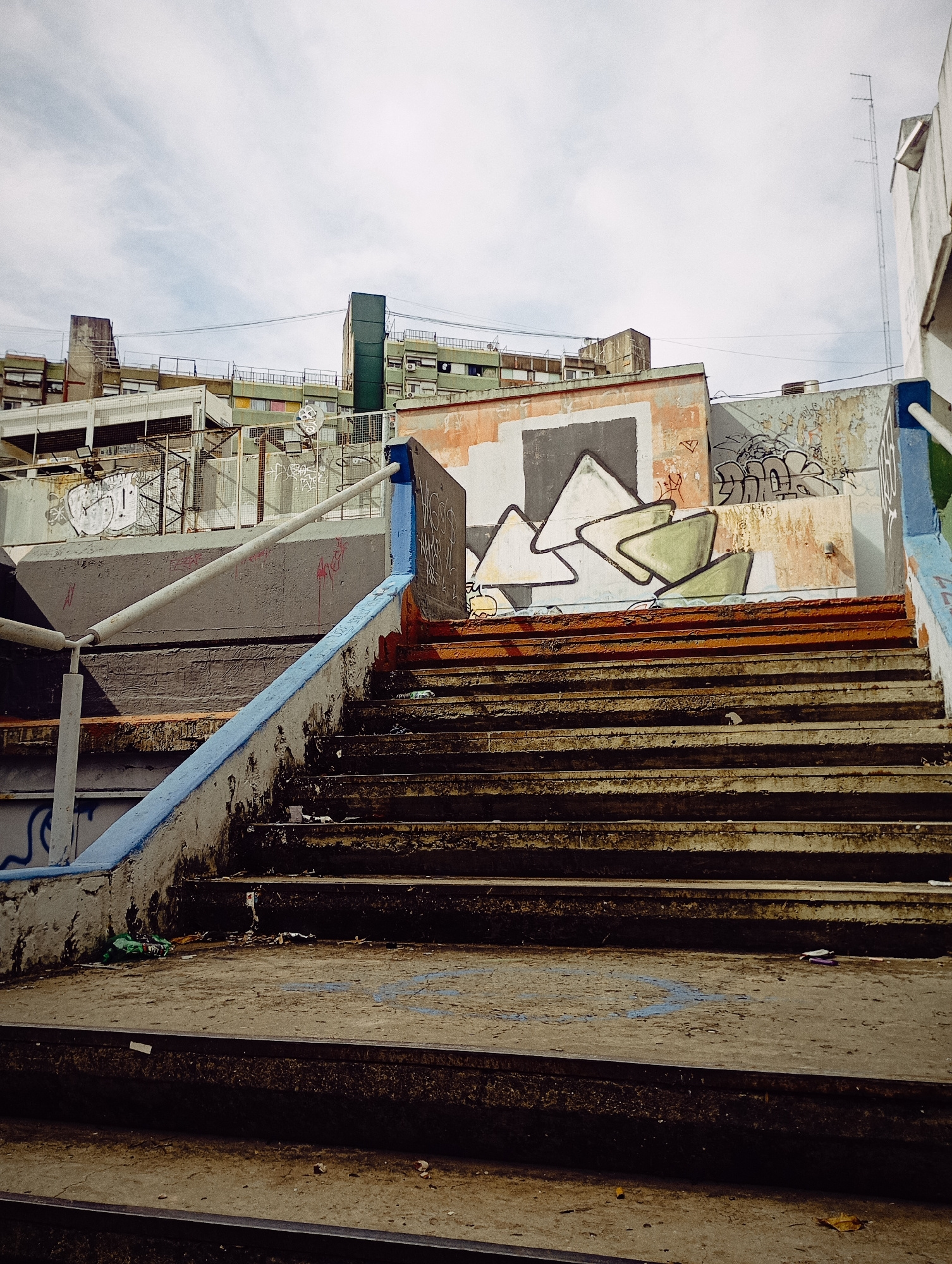 A set of outdoor concrete stairs with blue railings is depicted, leading up to a concrete wall adorned with graffiti. The stairs show signs of wear and dirt, with trash scattered on some steps. The wall behind the stairs features various graffiti tags, including abstract geometric shapes and illegible writings. The building complex in the background appears to be an urban residential area, composed of multiple buildings of varying heights. The sky is partly cloudy, casting an even light across the scene. The location is Buenos Aires, Argentina, as identifiable by distinctive graffiti styles and architecture. | Open Wire
