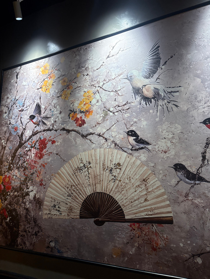 A framed painting depicts a scene with birds, a folding fan, and flowering branches against a mottled gray background. One bird flies downwards, while another is perched on a branch. A half-open fan w…read more
