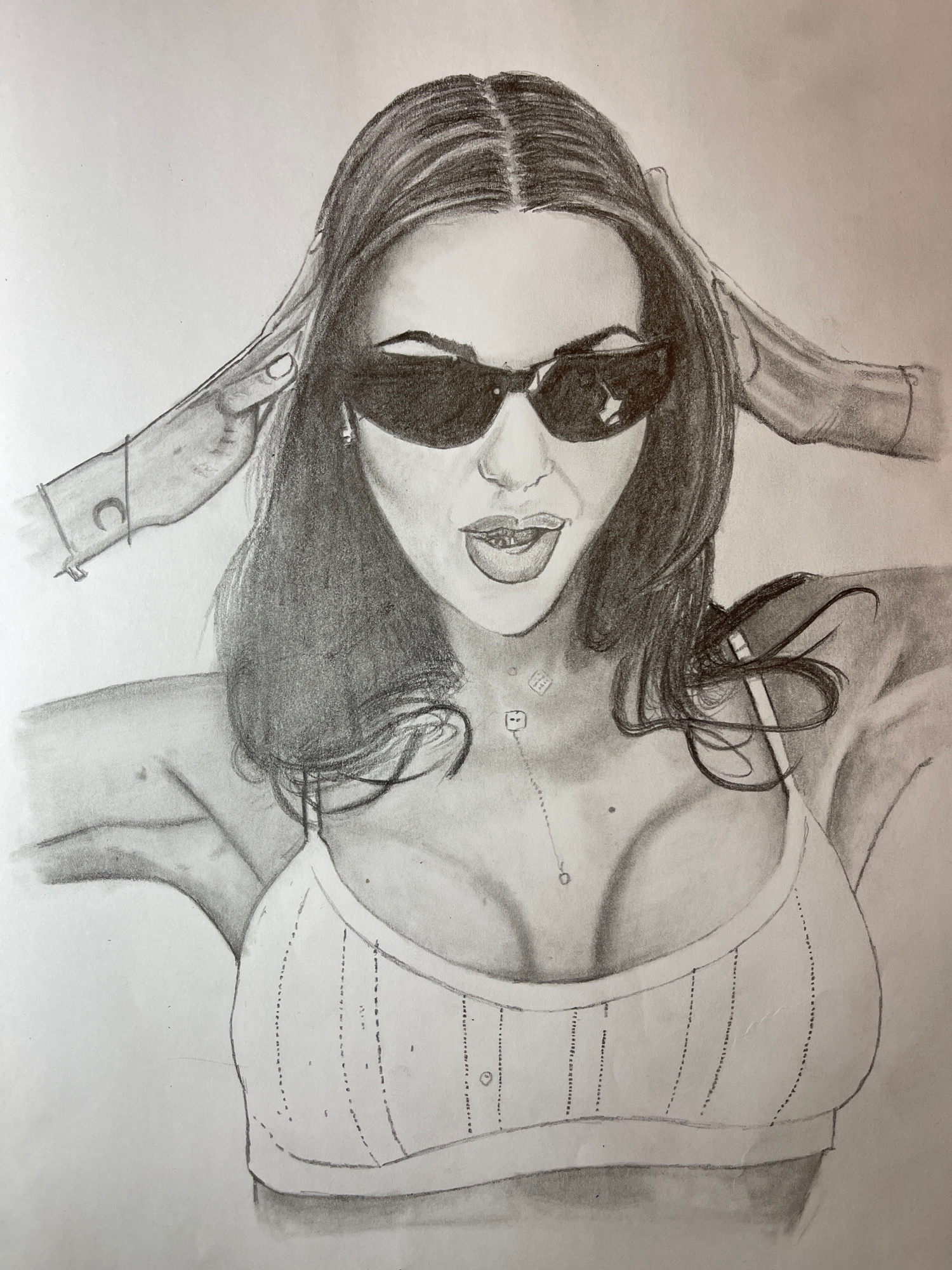 A charcoal drawing depicts a woman with sunglasses, lying on her side. She wears a light-colored, striped top. A necklace with small pendants adorns her neck, and a bracelet is on her wrist. One hand…read more