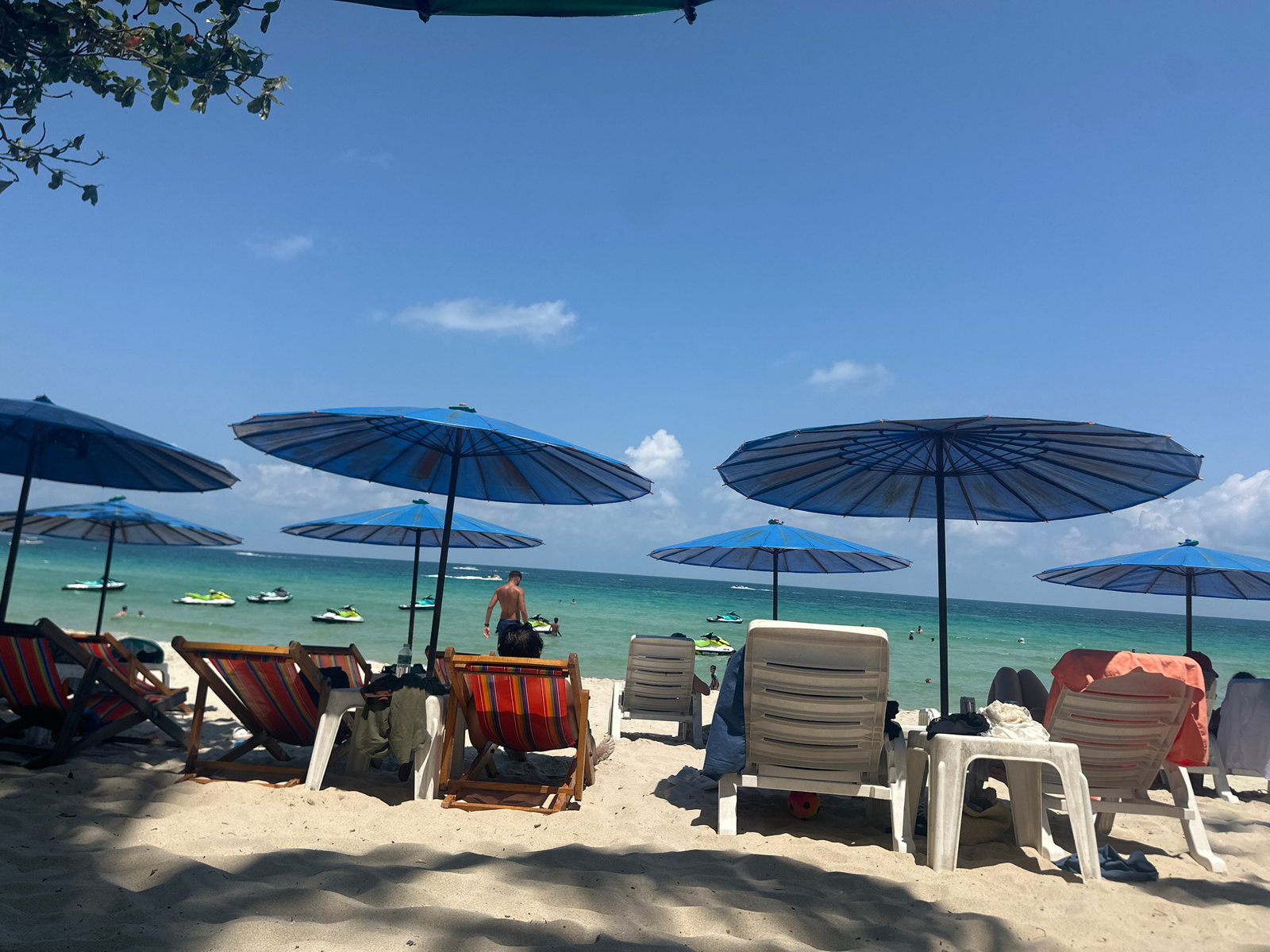 The image shows a sunny beach in Baan Chaweng, Thailand. Several blue beach umbrellas are erected over striped and white plastic beach chairs on a sandy beach. In the background, the turquoise ocean i…read more