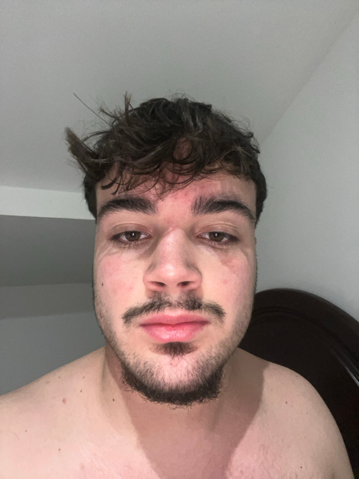 A man with damp, curly dark hair and a dark beard stares intensely at the camera. His skin shows signs of redness and possible irritation, particularly around his forehead and cheeks. The lighting hig…read more