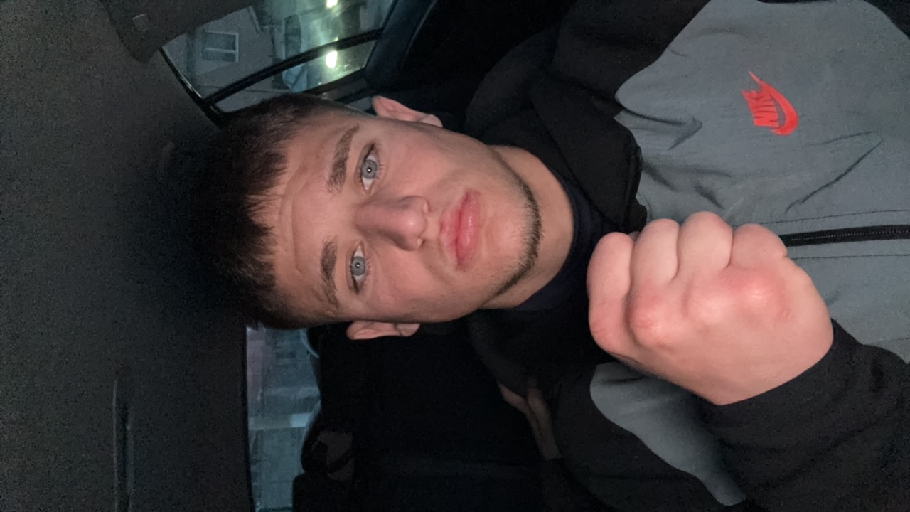 A young man with blue eyes is sitting in a car. He is wearing a dark blue turtleneck and a gray and black Nike jacket. He runs his hand through his short brown hair and looks directly at the camera wi…read more